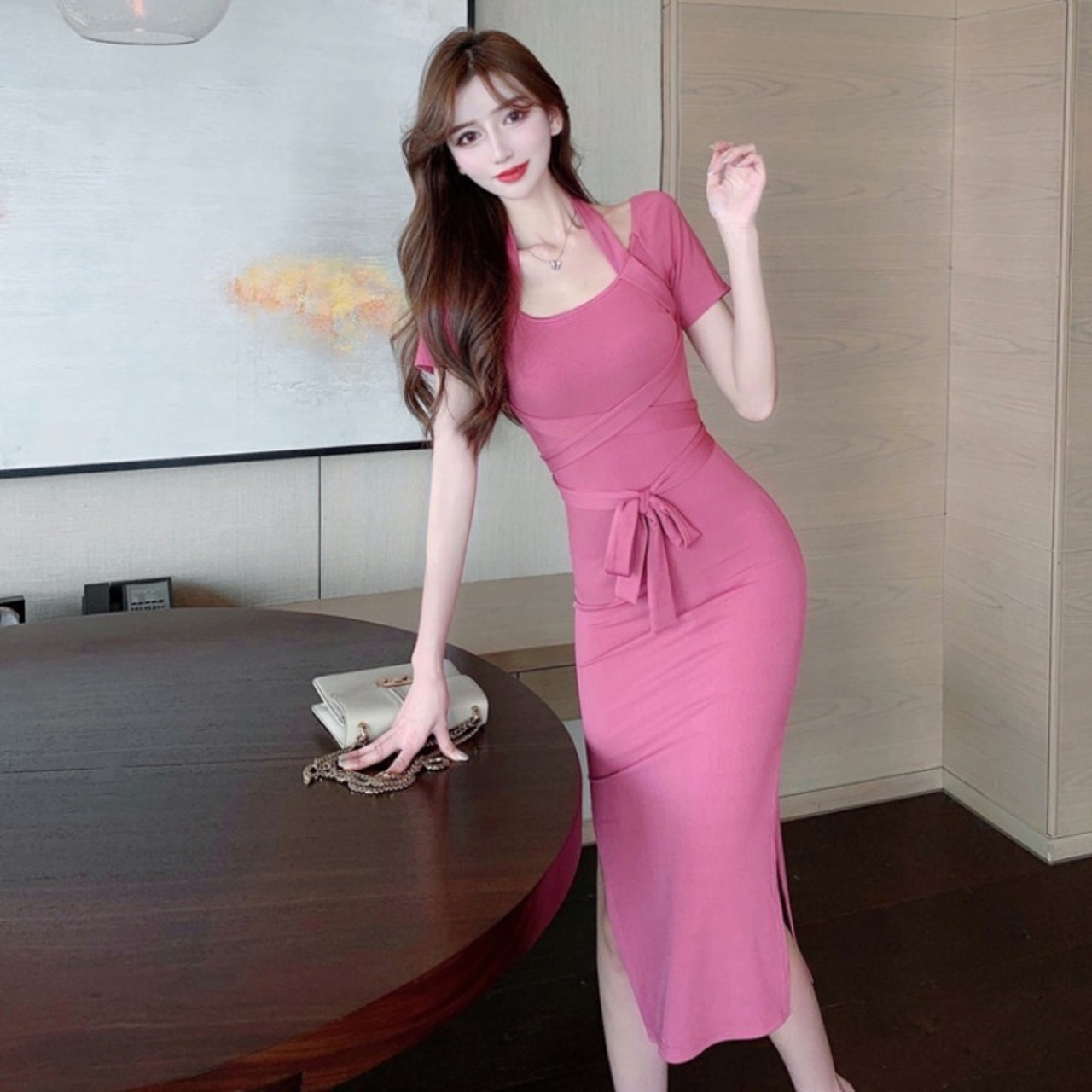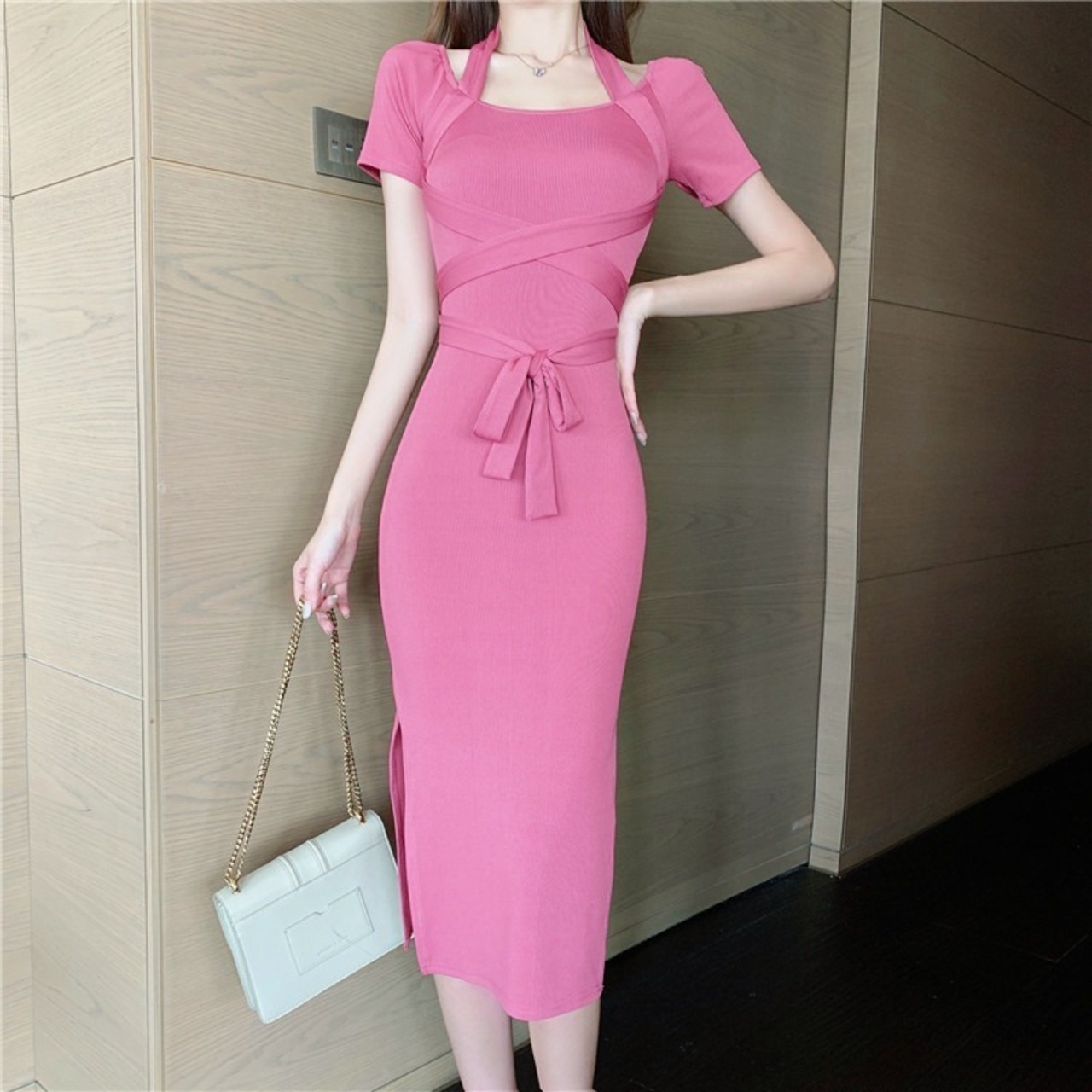 ドレスワンピース ドレス レディース 半袖 タイト リボン スリット セクシー パーティー 二次会 お呼ばれ 記念日 MH3092