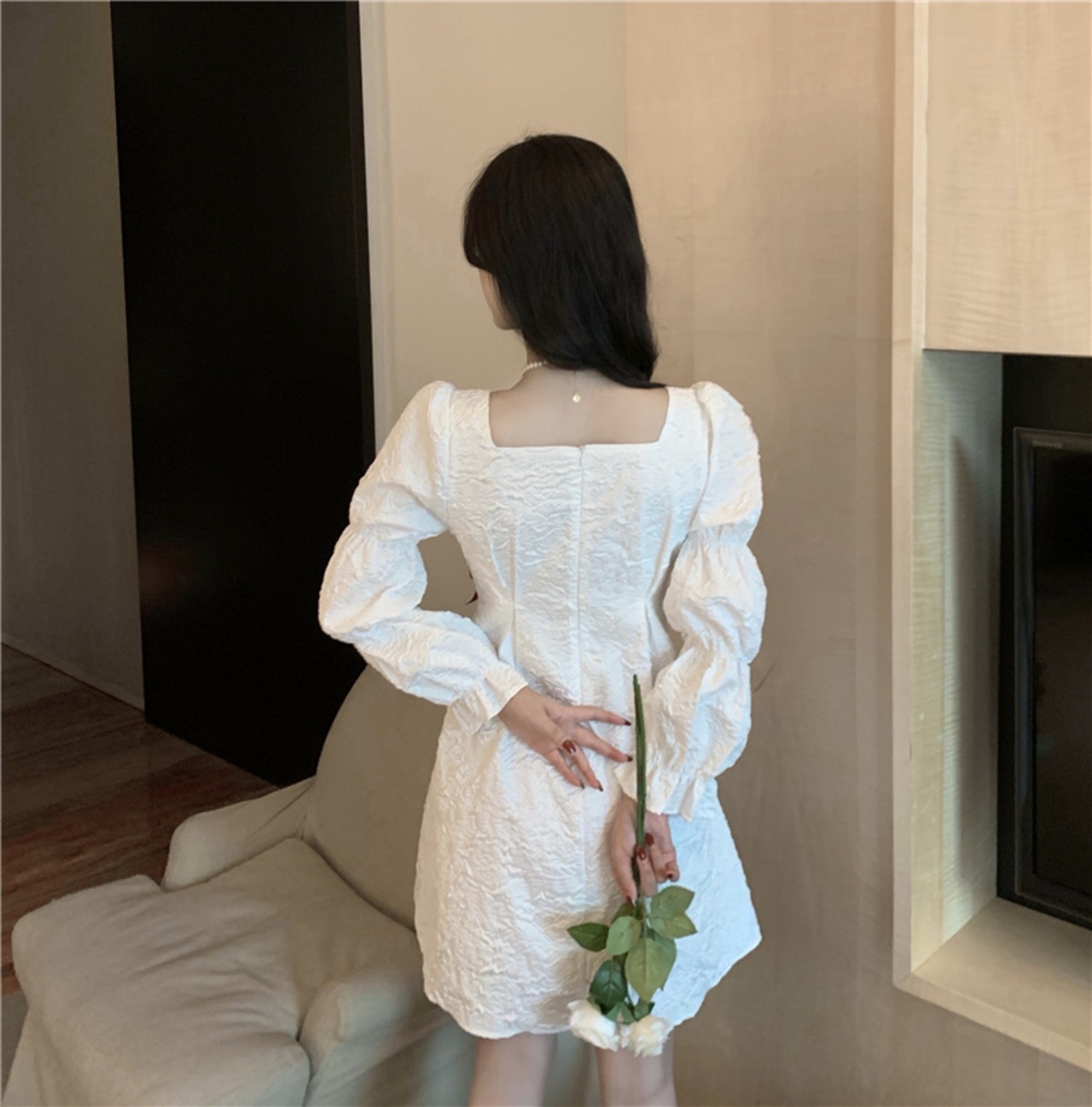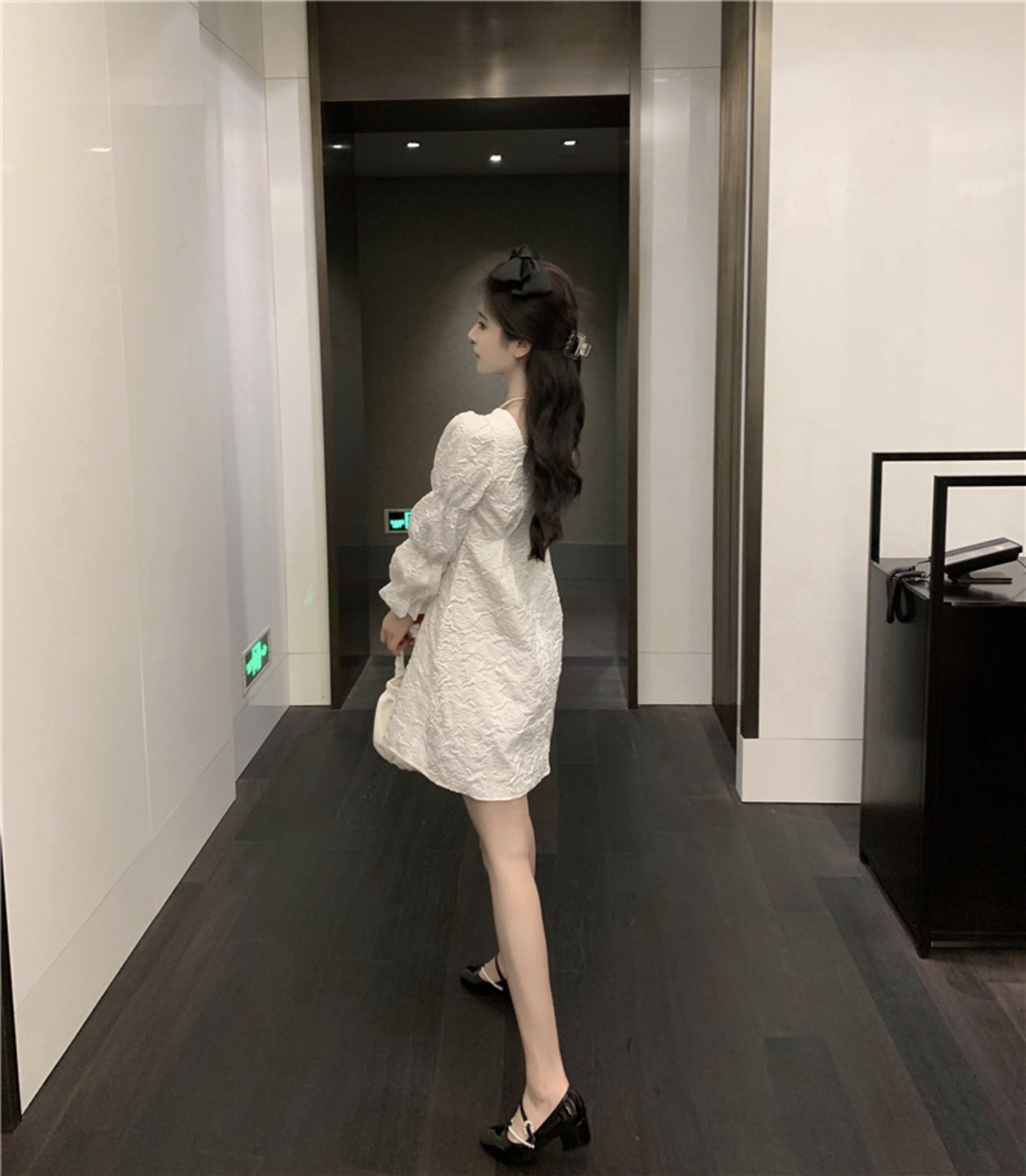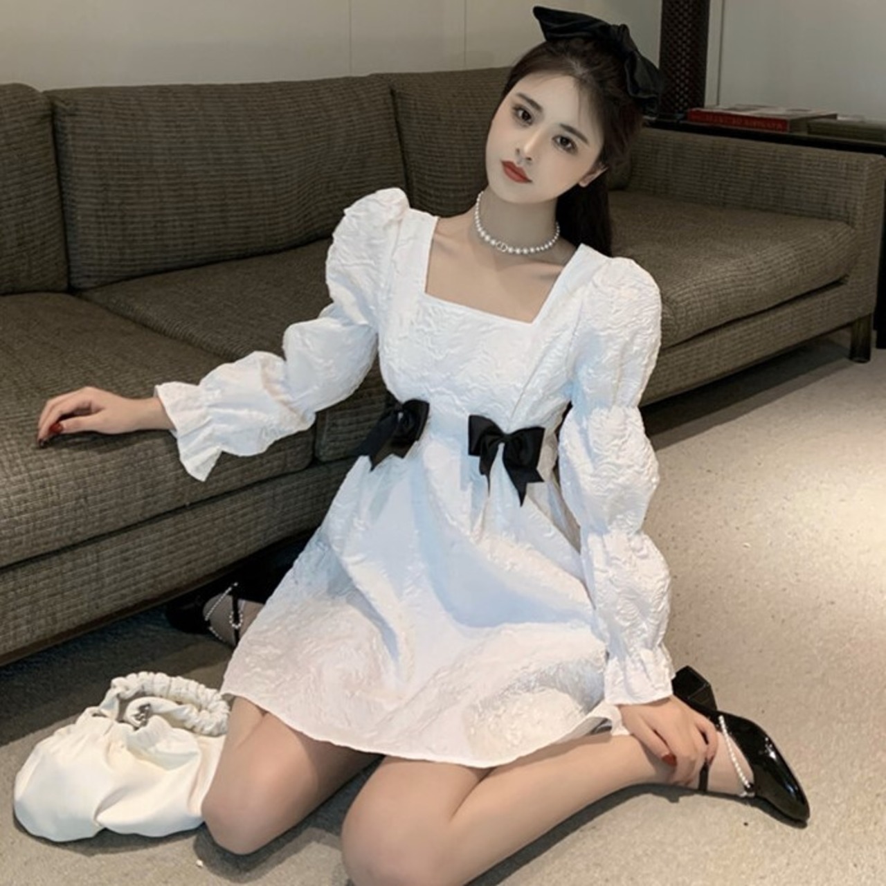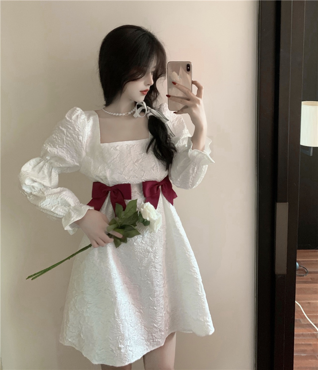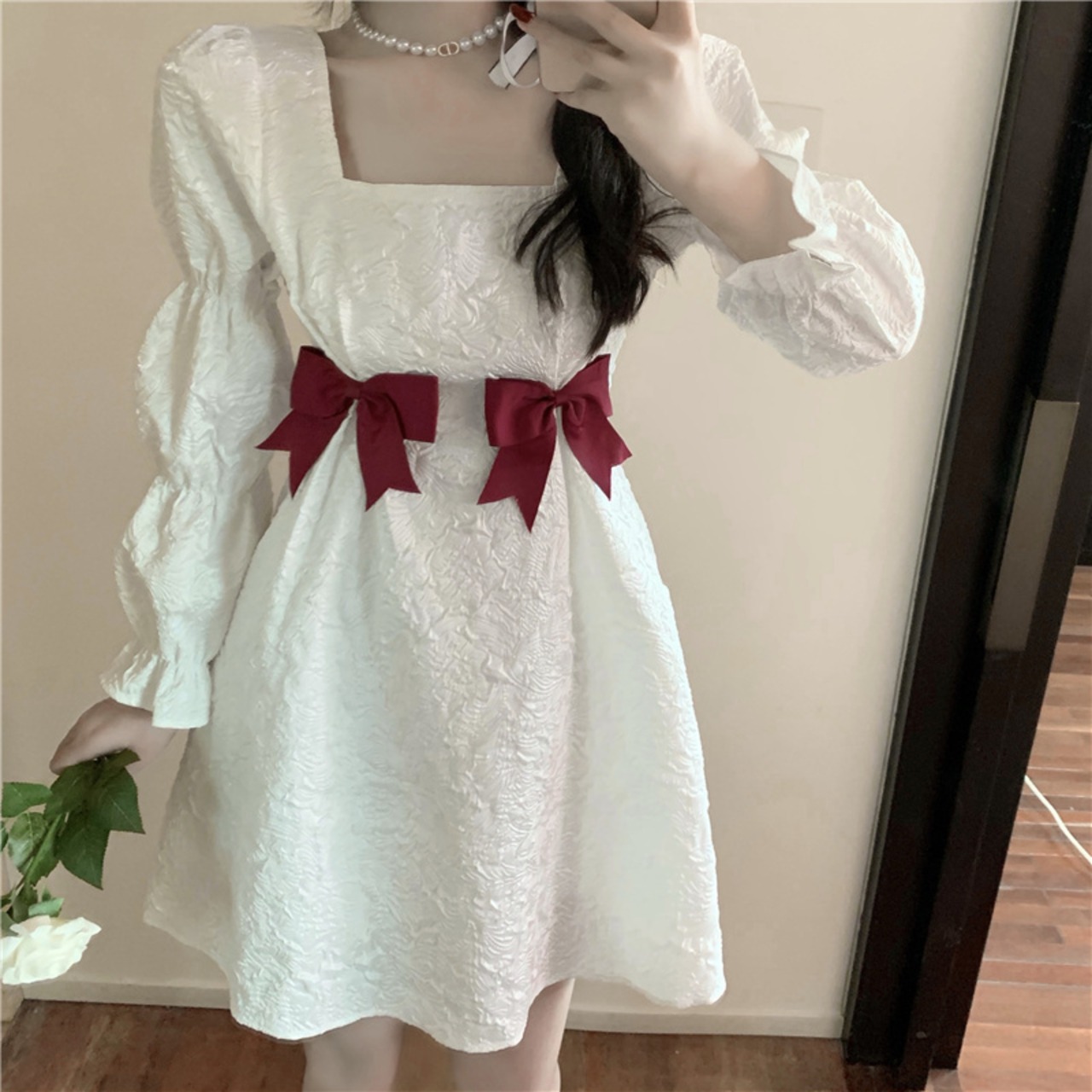 ワンピース レディース 長袖 ミニ丈 スクエアネック リボン ガーリー キュート デート お出かけ MH3108