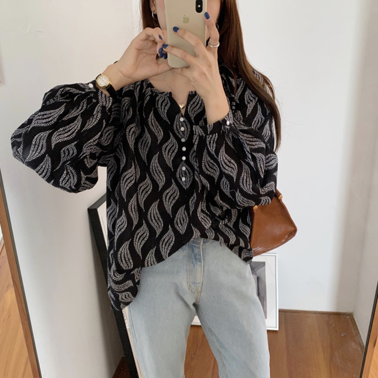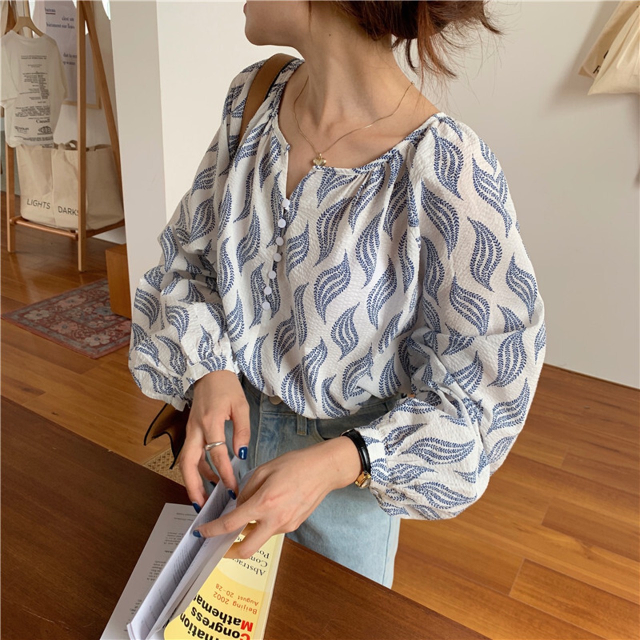 ブラウス トップス レディース 長袖 ボタニカル柄 レトロ デコルテ ママコーデ デート お出かけ MH3124