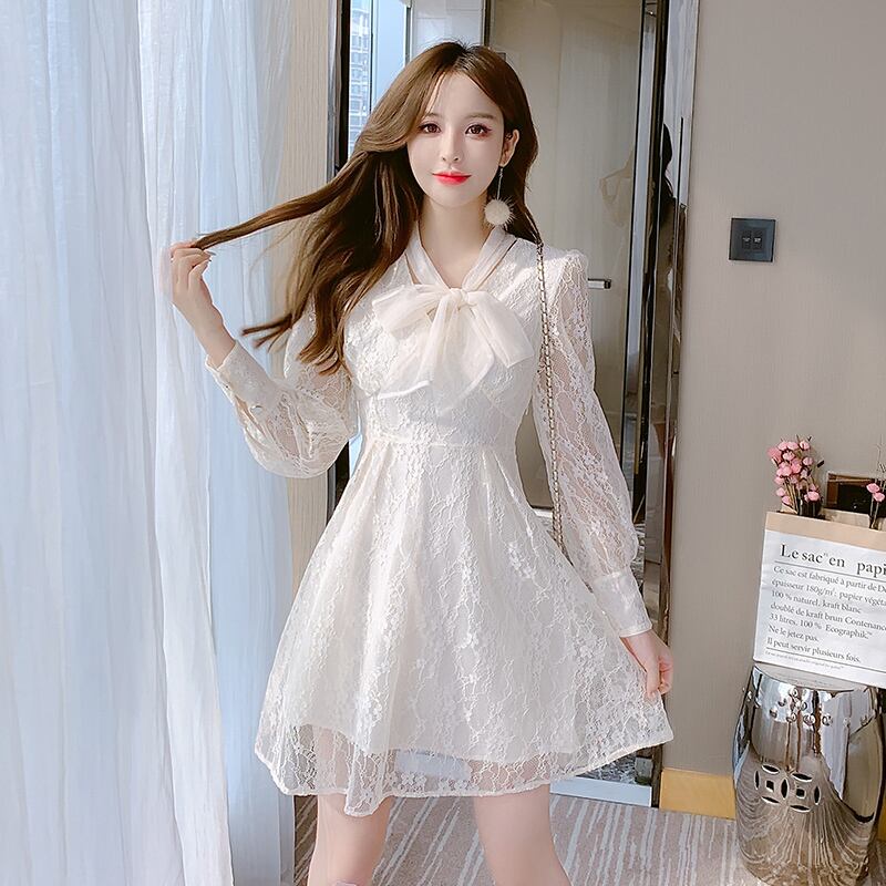 ワンピース レディース ミニ丈 レース ボウタイ フェミニン 甘め 長袖 ガーリー デート お出かけ MH3142