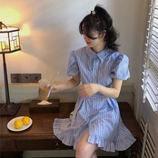 シャツワンピース レディース ミニ丈 半袖 ストライプ パフスリーブ フリル ガーリー デート お出かけ MH3167