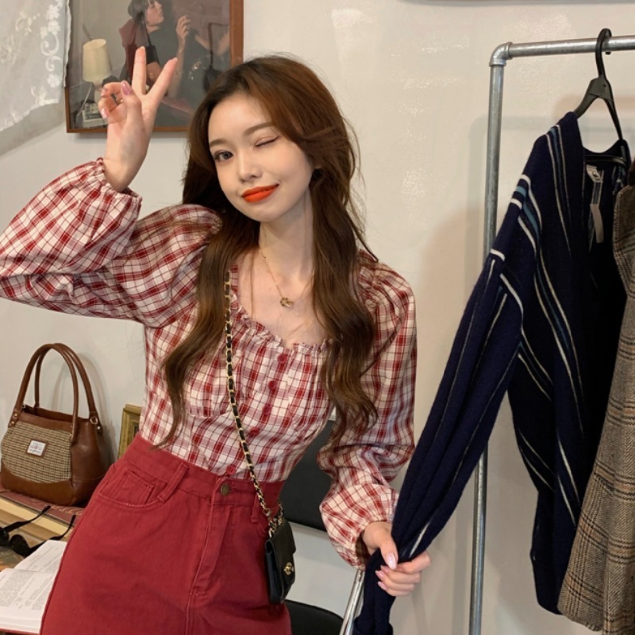 ブラウス トップス レディース 長袖 チェック柄 スクエアネック ガーリー 春 秋 ママコーデ デート お出かけ MH3179