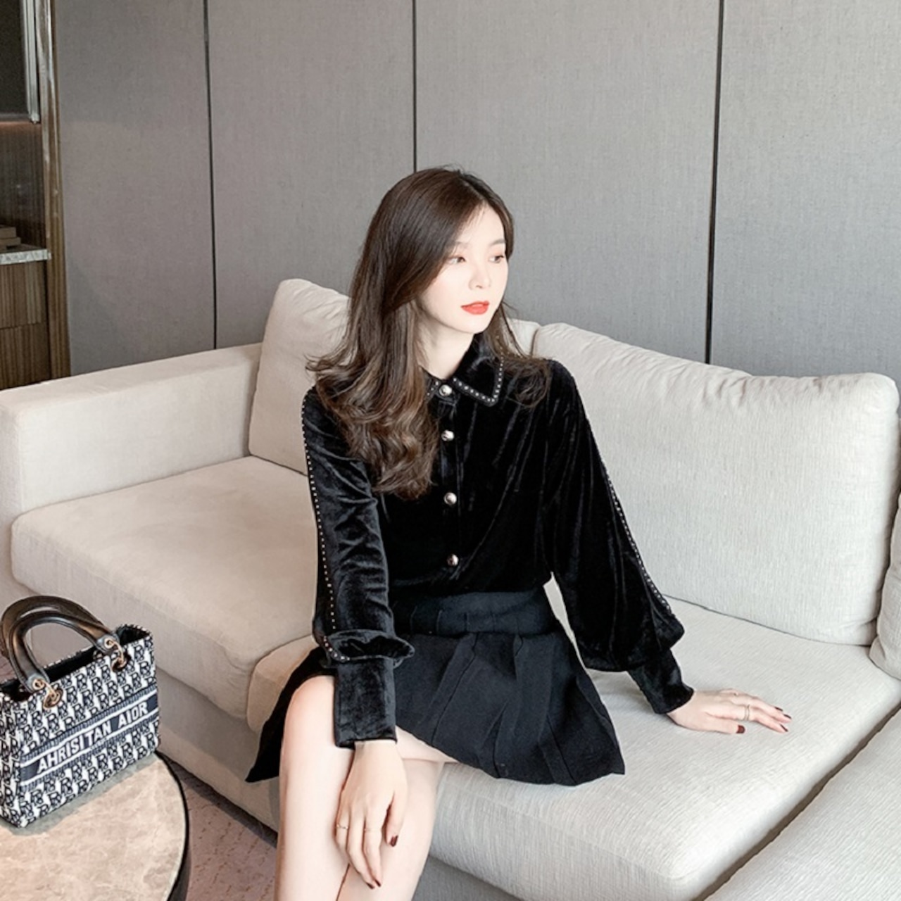 シャツ トップス レディース 長袖 ベルベット ブラック ベロア 秋 大人っぽい ガーリー デート お出かけ MH3194