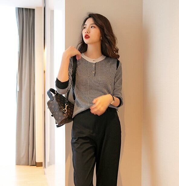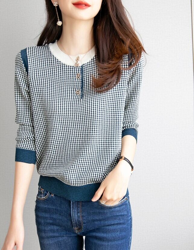 セーター ニット 秋冬 レディース プルオーバー ラウンドネック バイカラー チェック 長袖 千鳥格子 シック オフィス ab2060