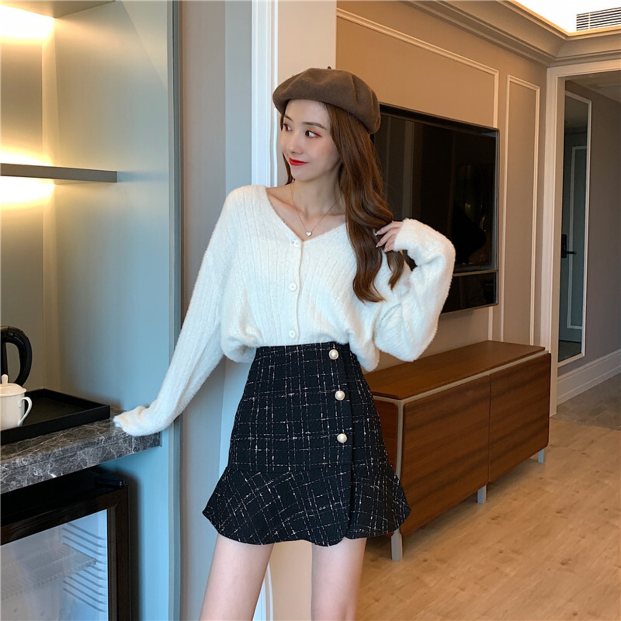 ミニスカート スカート レディース ミニ丈 ハイウエスト フィッシュテール ボタン ツイード ガーリー デート お出かけ MH3204
