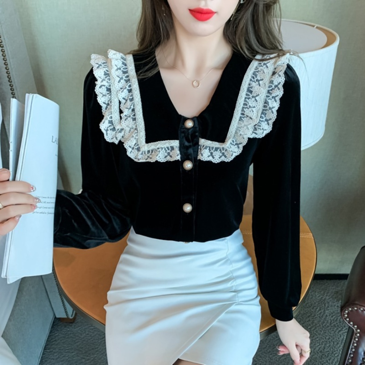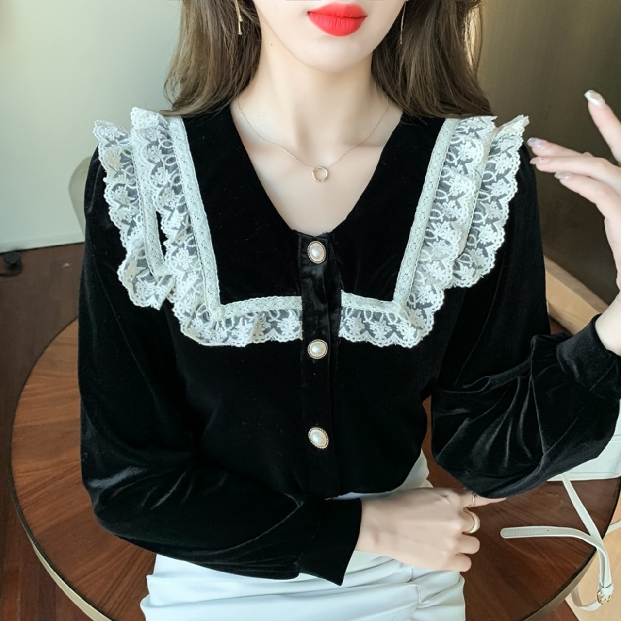 ベロアシャツ トップス レディース 長袖 スクエアカラー ベロア パールボタン レース 秋 ママコーデ デート お出かけ MH3215