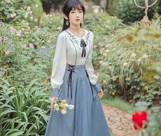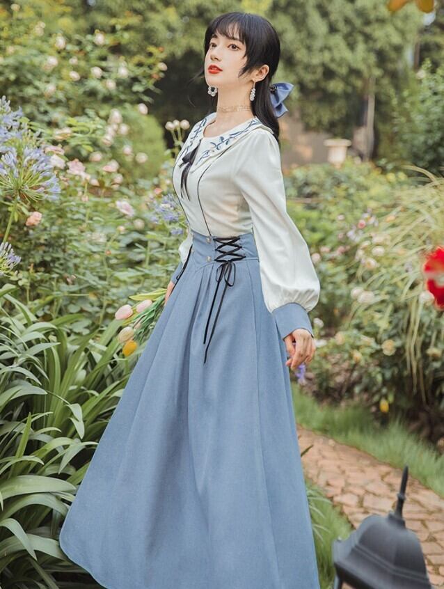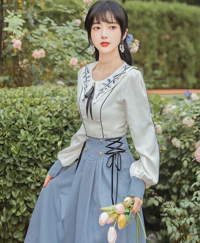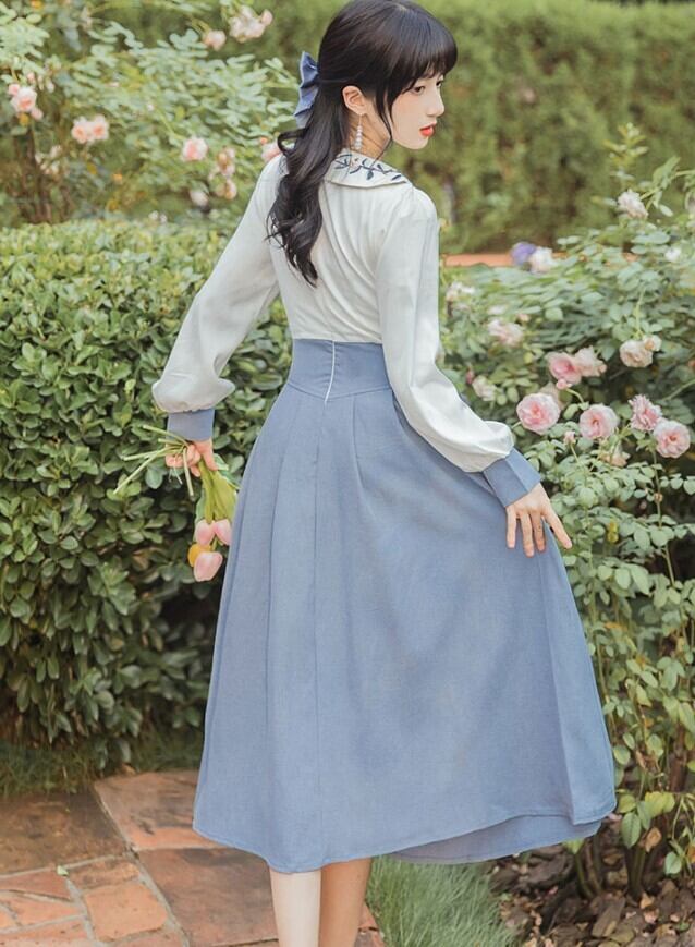 ワンピース レディース 春秋 バイカラー フェイクツーピース 花刺繍 リボン レトロ プチプラ フェミニン ab2063