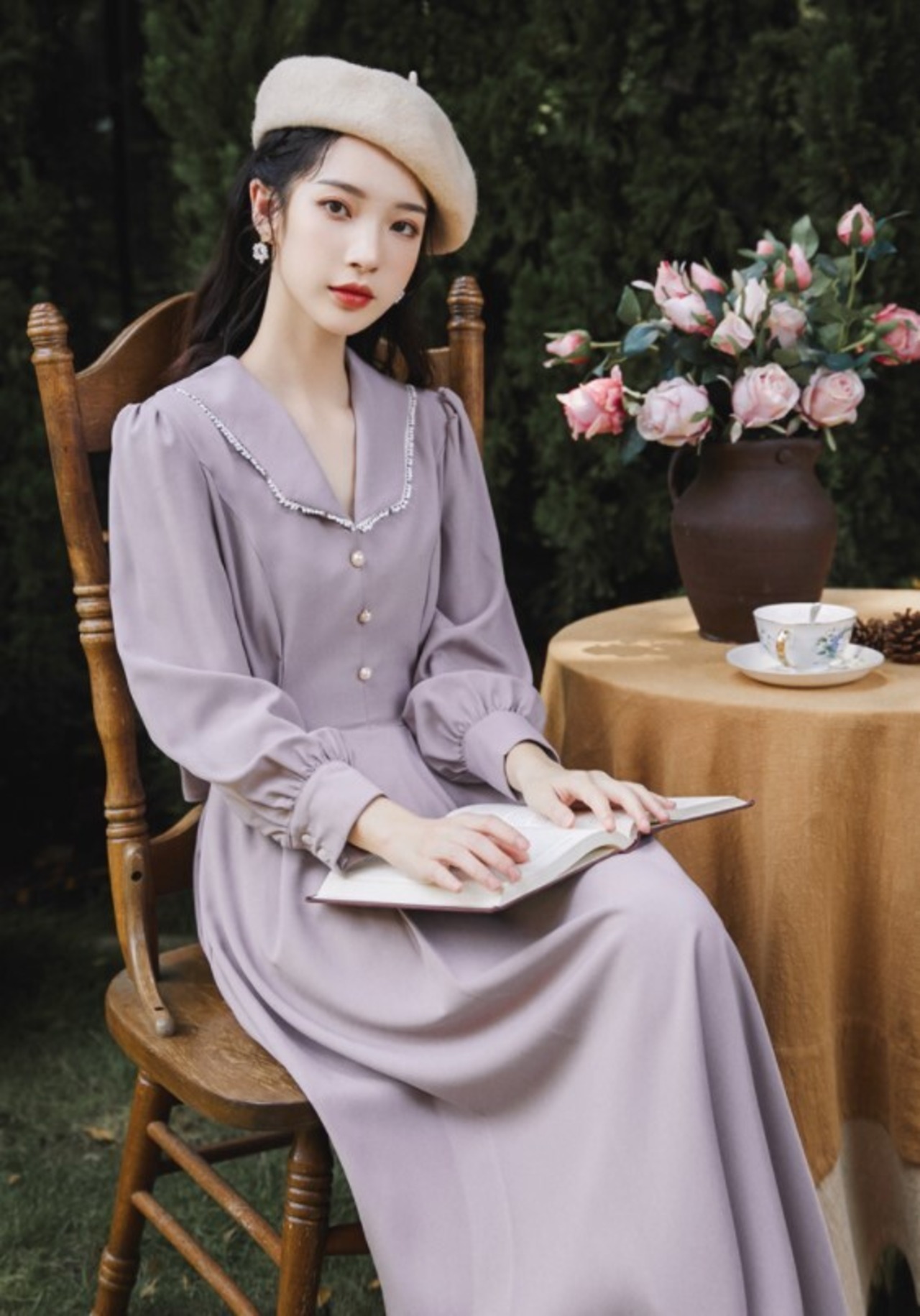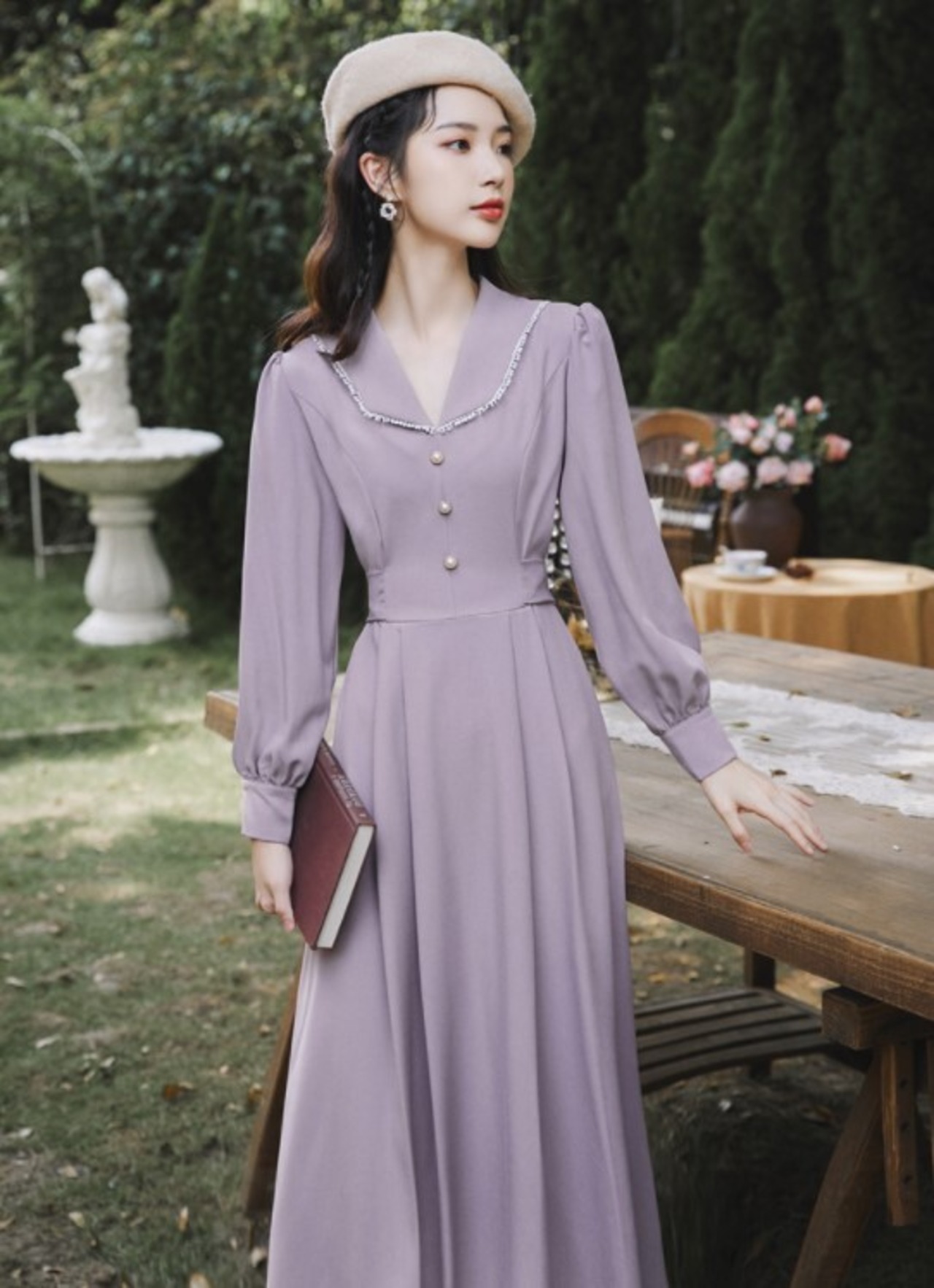 ワンピース ミモレ丈 秋冬 レディース Vネック 長袖 レトロ ボタン ラベンダー ハイウエスト Aライン プチプラ ab2065