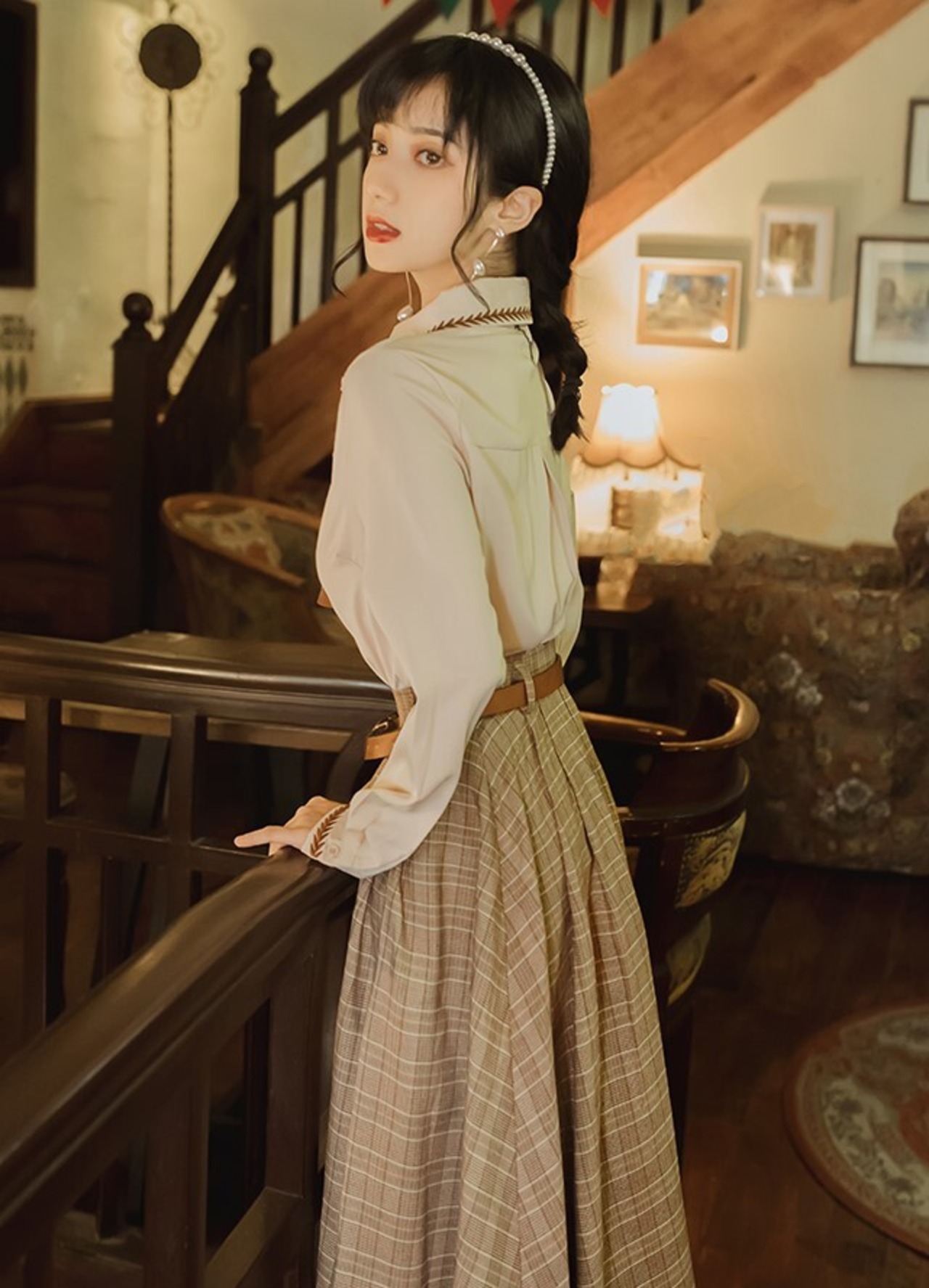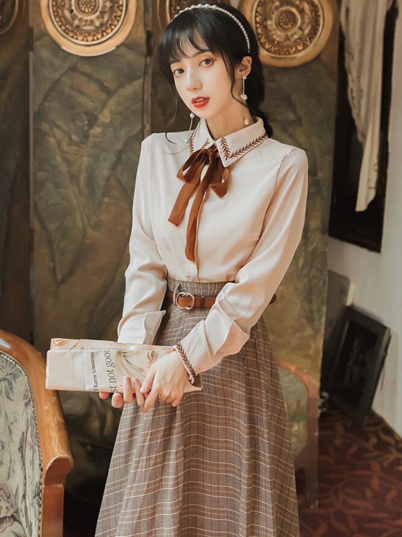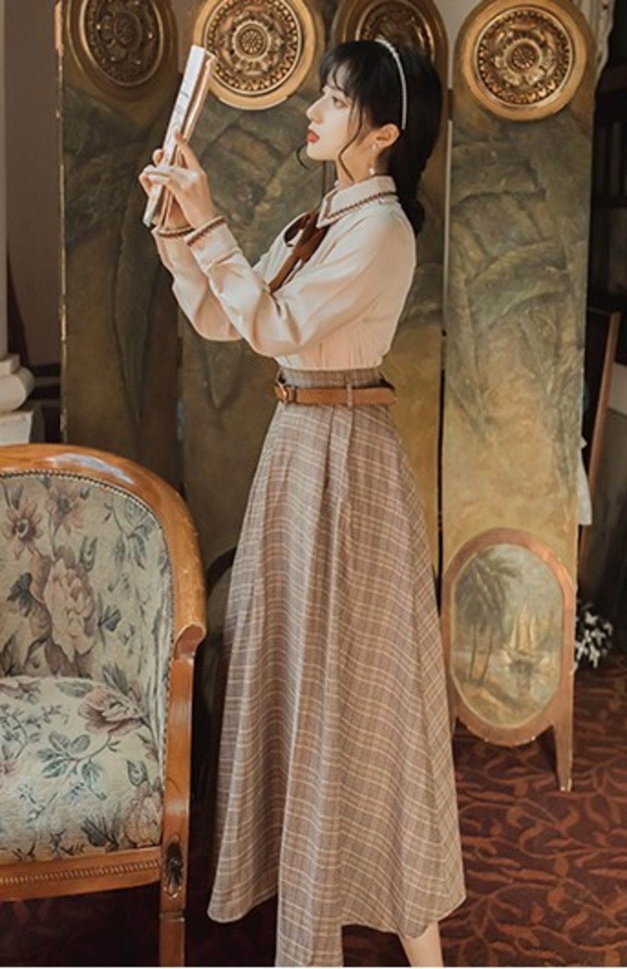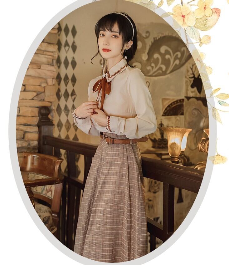 セットアップ ツーピース レディース 秋冬 チェック レトロ ブラウス リボン ハイウエスト Aライン ガーリー ab2066