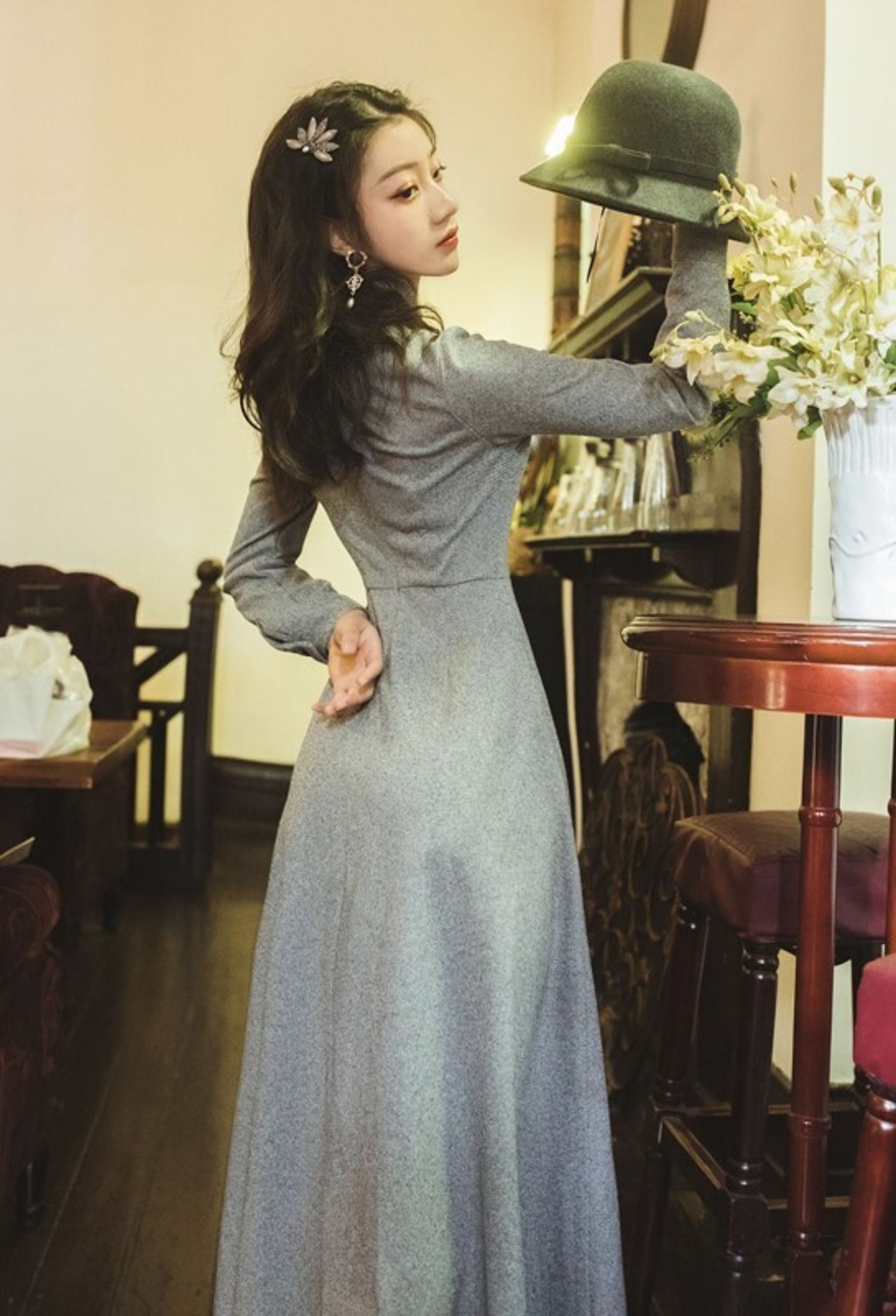 ワンピース チャイナ風 ロング丈 シンプル レトロ レディース 秋冬 ロング丈 ハイウエスト Aライン ママコーデ 長袖 シック ab2067