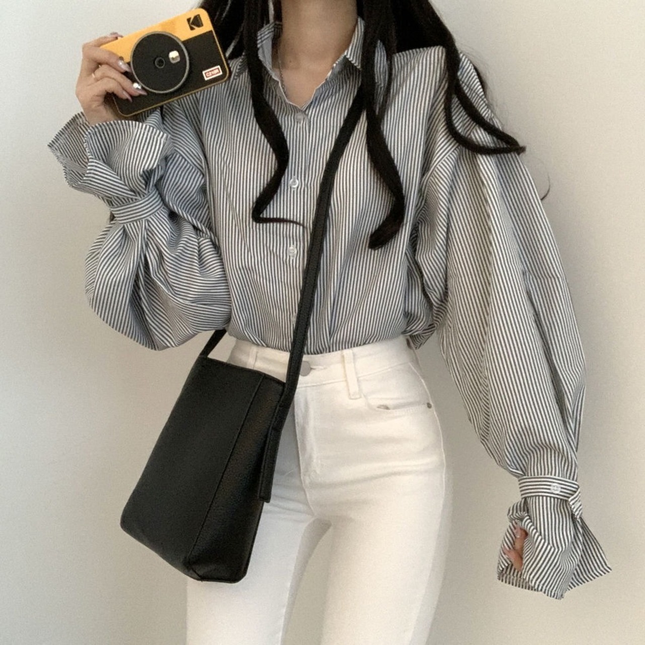 シャツ トップス レディース 長袖 ストライプ トランペットスリーブ バルーン袖 ボリューム袖 きれいめ ママコーデ 通勤 デート お出かけ MH3229