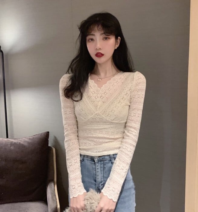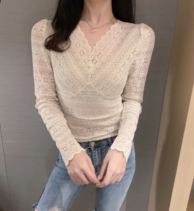 プルオーバー シャツ レディース レース レトロ 春秋 Vネック 透け感 長袖 エレガント プチプラ フリル ガーリー ab2090