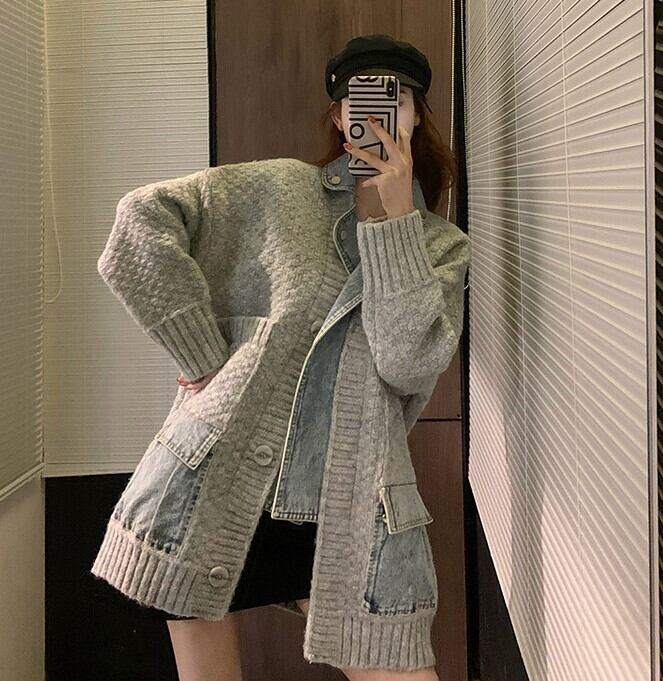 ジャケット カーディガン ニット デニム レディース 秋冬 異素材 ドッキング セミロング 長袖 カジュアル レトロ ハイウエスト プチプラ ab2091