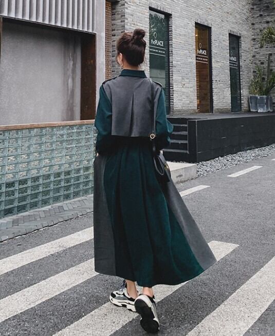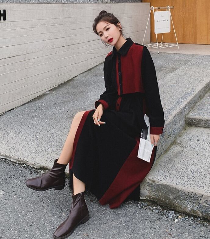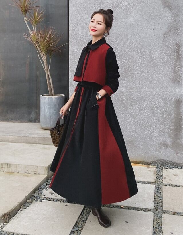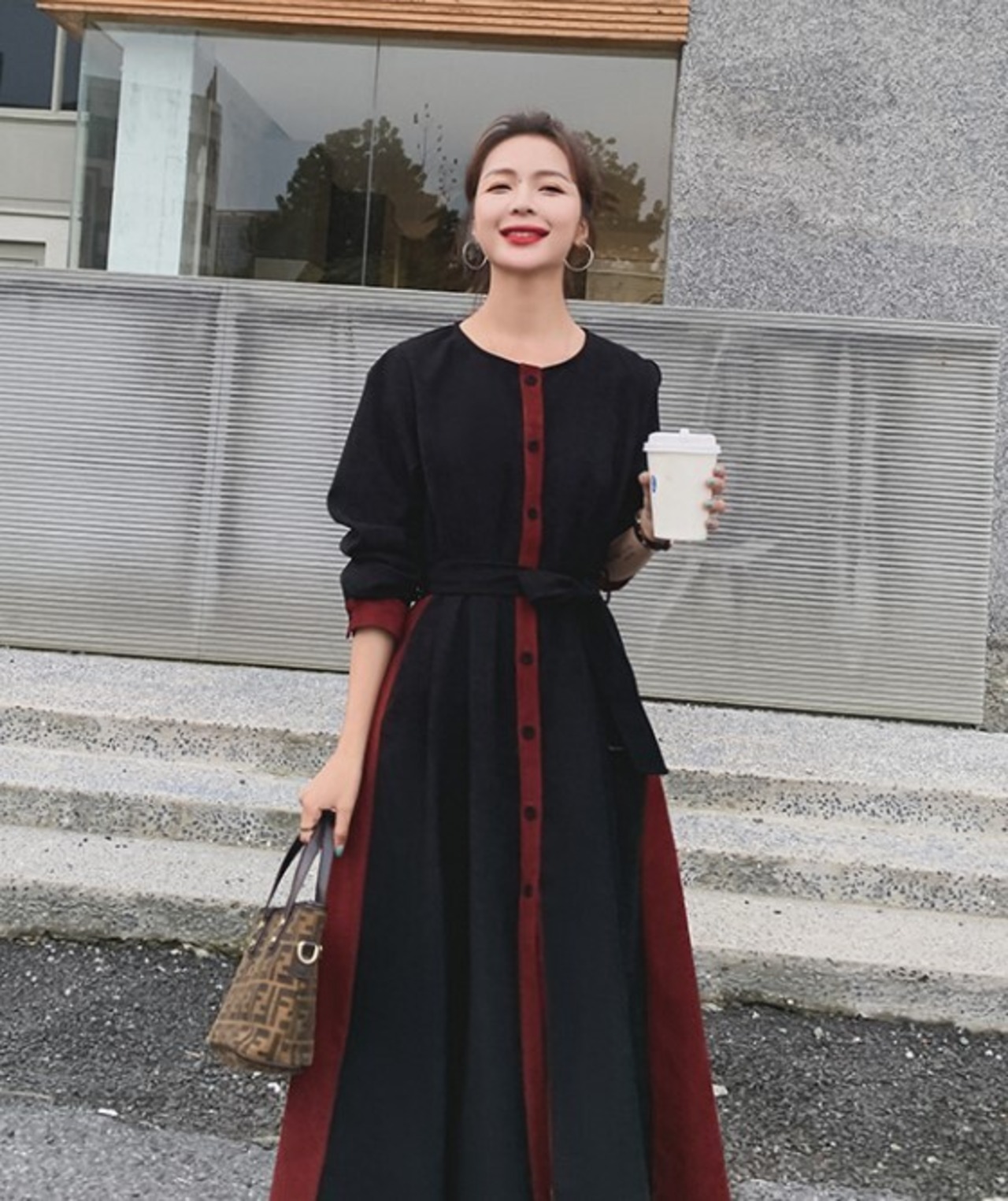 ワンピース ツーピース セットアップ 秋冬 レディース バイカラー ロング丈 長袖 ハイウエスト ガーリー Aライン ab2092