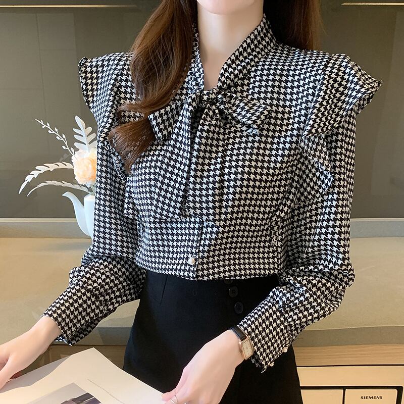 ブラウス トップス レディース 千鳥格子柄 シフォン 長袖 フリル ボウタイ 大人可愛い ママコーデ デート お出かけ MH3354