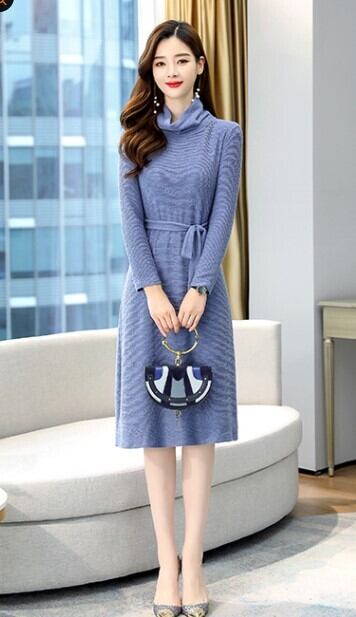 ワンピース レディース 秋冬 ひざ丈 ハイネック 長袖 無地 ベルトリボン ガーリー オフィス おでかけ シック プチプラ 通勤 ab2170