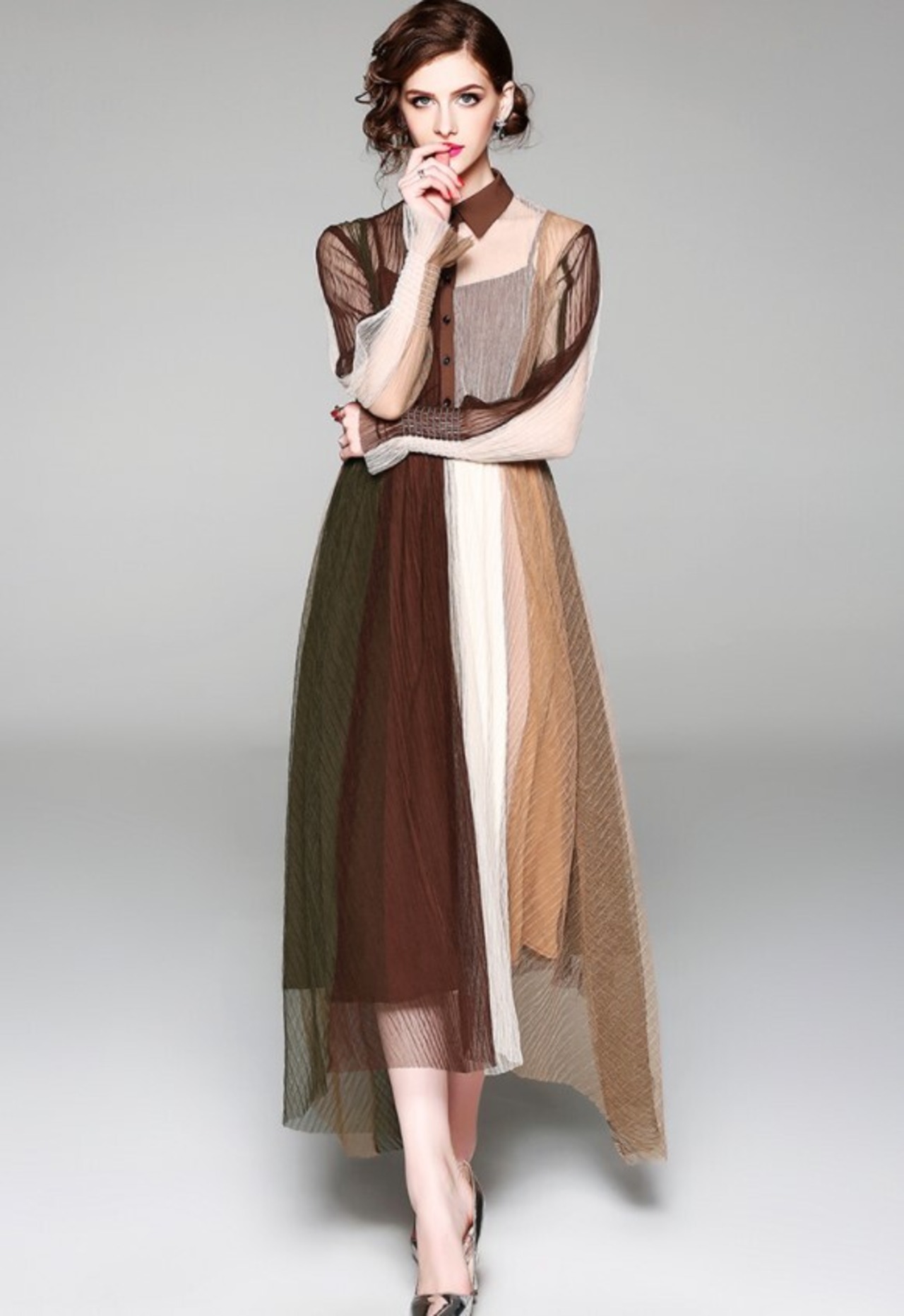 ワンピース レディース ロング丈 春秋 シースルー コントラスト 透け感 長袖 襟付き エレガント カジュアル ふんわり ab2177