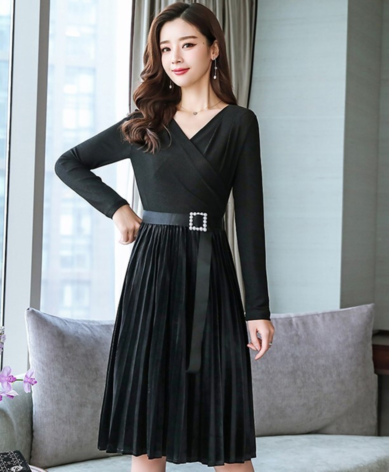 ワンピース レディース ミニ丈 異素材ミックス ドッキングワンピ 春夏 長袖 Vネック プリーツスカート シック ガーリー プチプラ ab2184