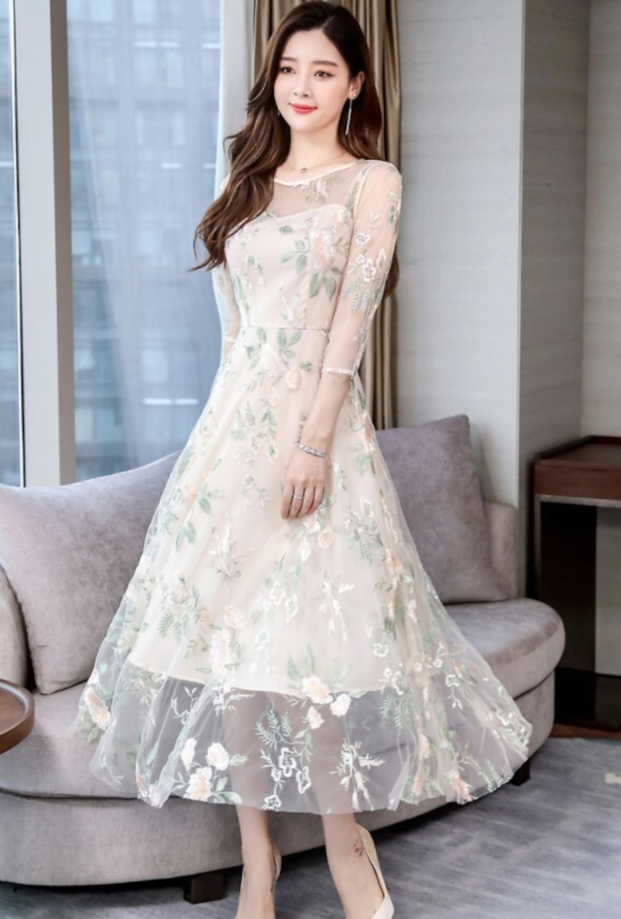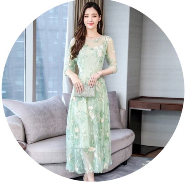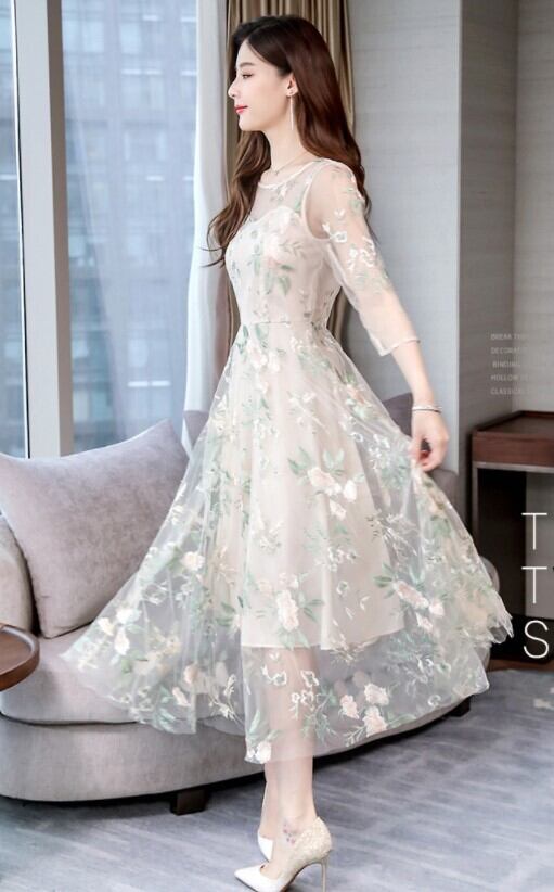 ワンピース 春夏 春ワンピ レース レディース パーティーワンピ ミモレ丈 シースルー 五分袖 花柄 お呼ばれ Aライン ラウンドネック プチプラ ab2196
