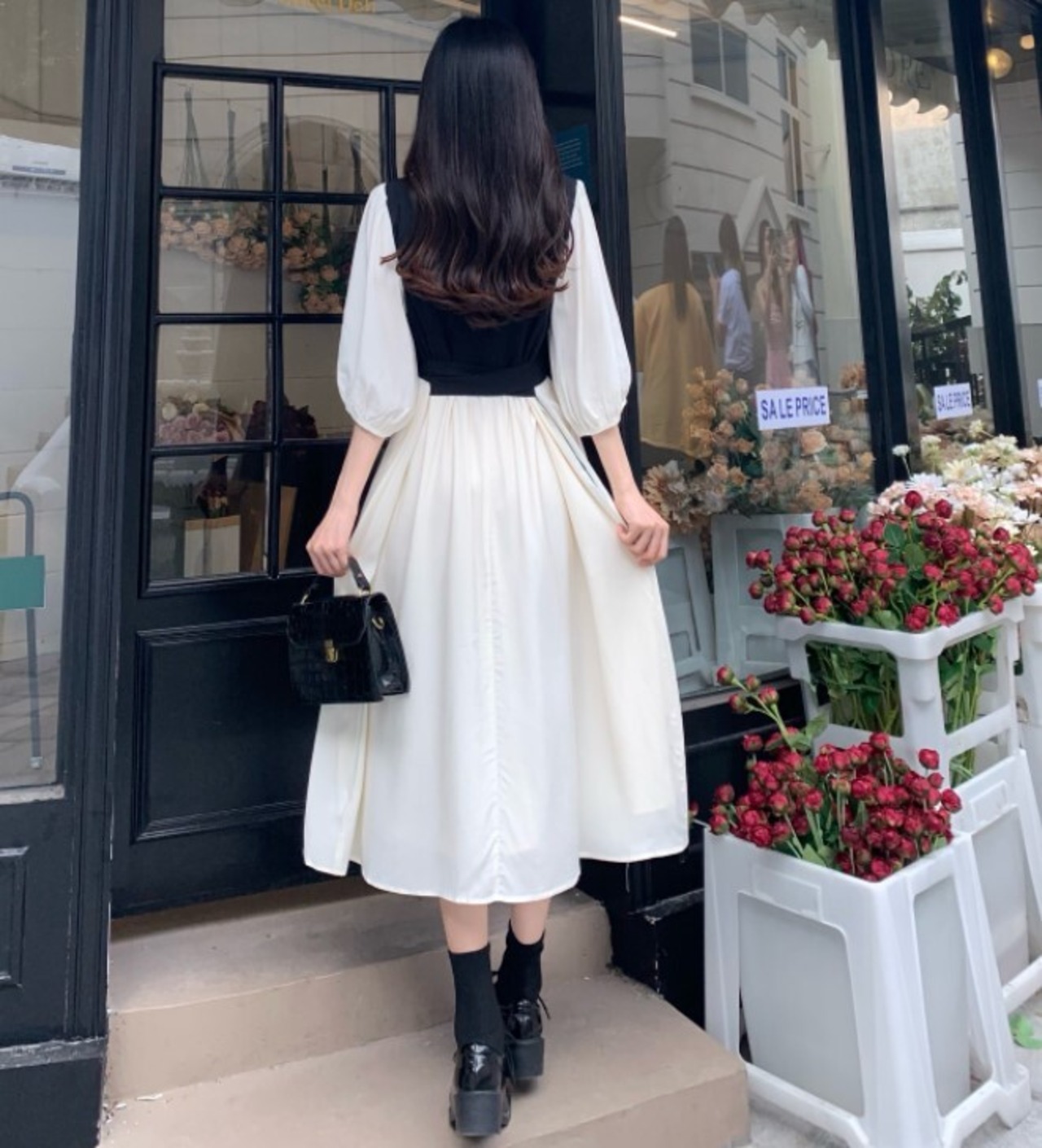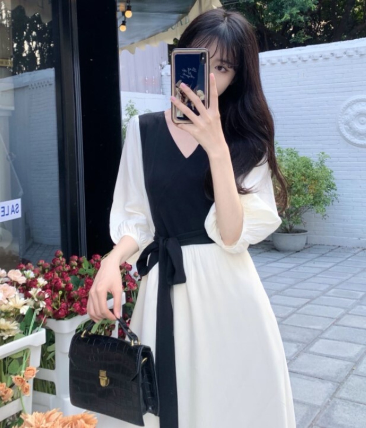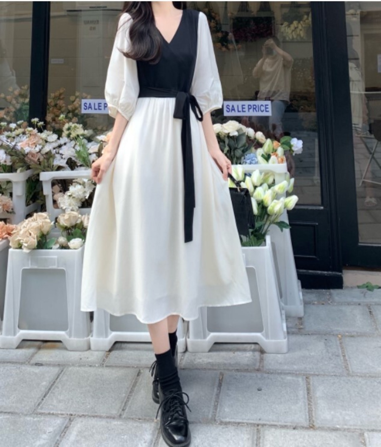 ワンピース バイカラー レディース 春夏 ミモレ丈 Vネック 五分袖 ガーリー リボン ハイウエスト フレアスカート フェミニン Aライン ab2207