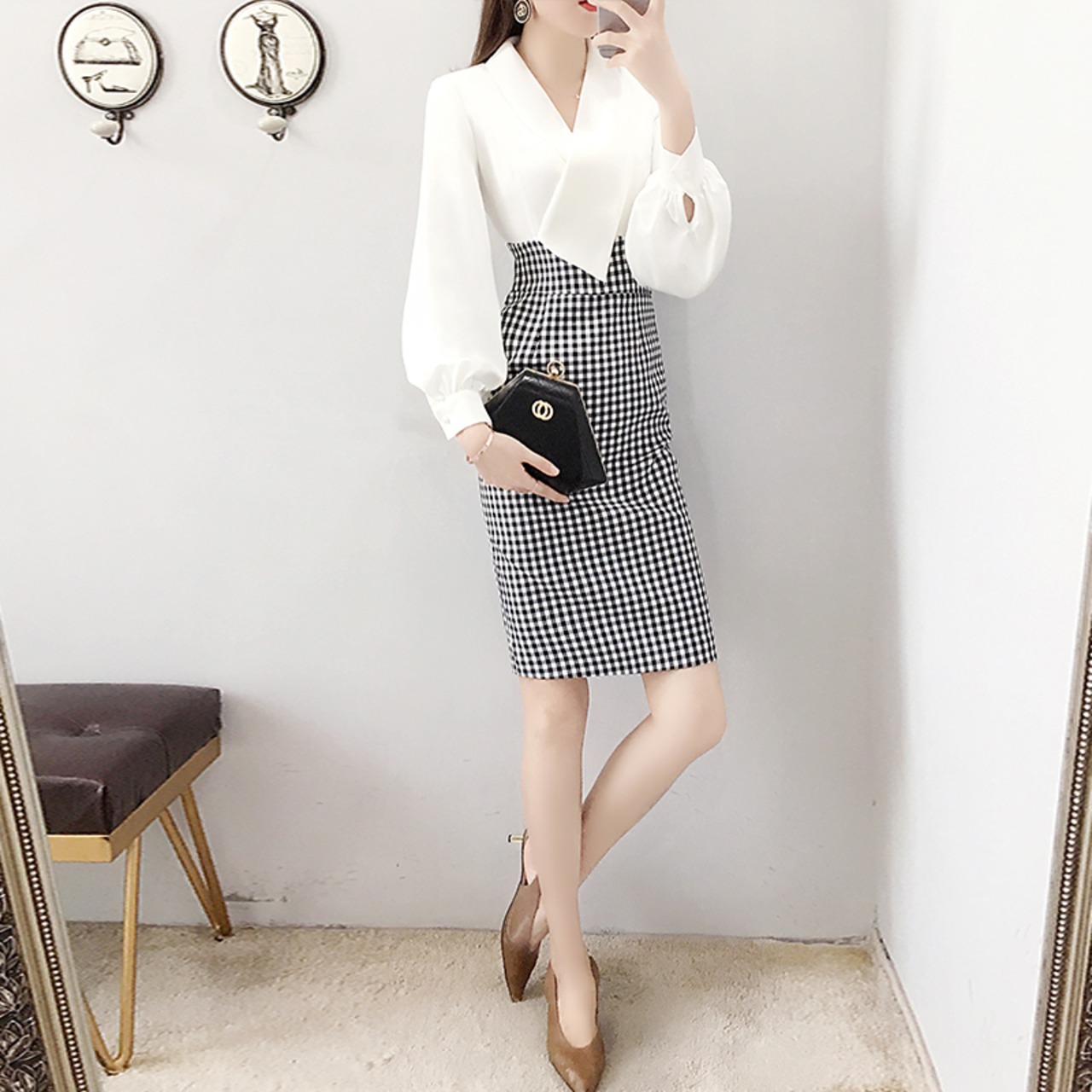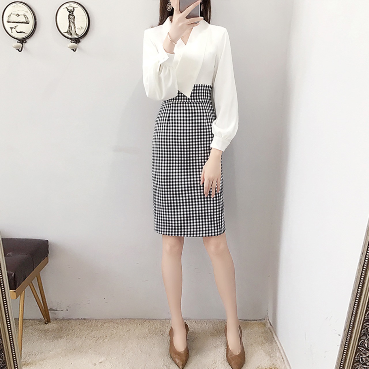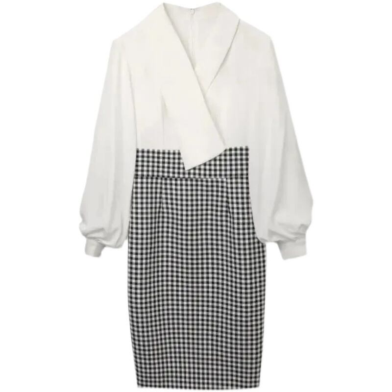 切り替えタイトワンピース ワンピース タイト 長袖 切り替え チェック シック 上品 OL 通勤 ママコーデ デート お出かけ MH3378