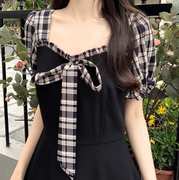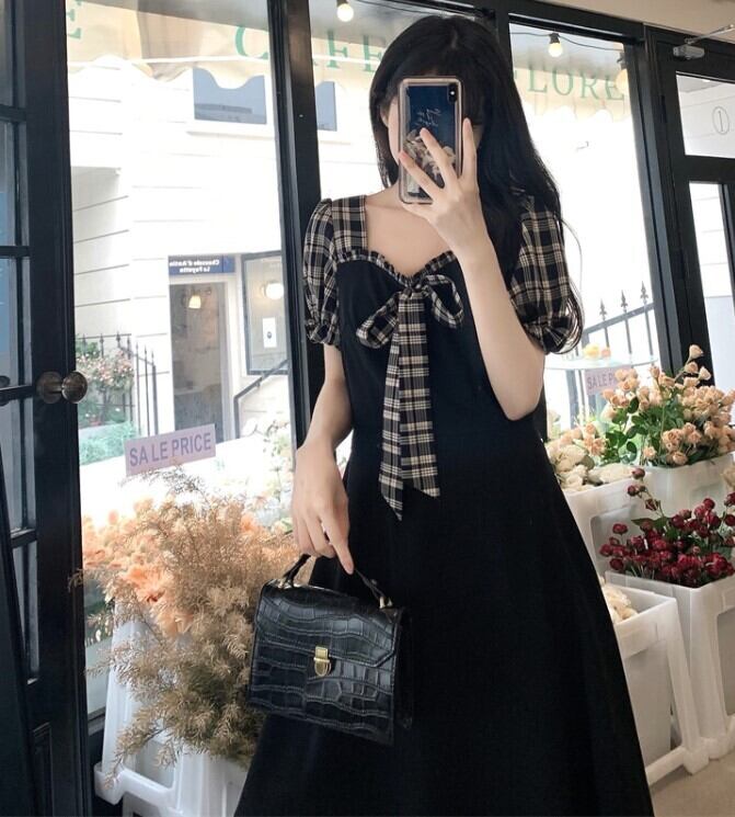 ワンピース レディース 春夏 ミモレ丈 シック チェック リボン 半袖 フェミニン フェイクツーピース ハイウエスト Aライン キュート ab2213