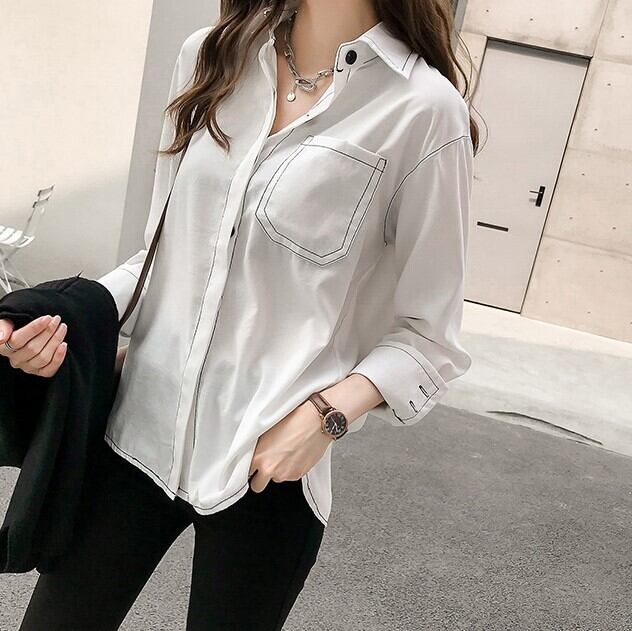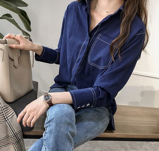 シャツ トップス レディース 春秋 長袖 ステッチ ポケット クール カジュアル オフィス テレワーク プチプラ ab2214