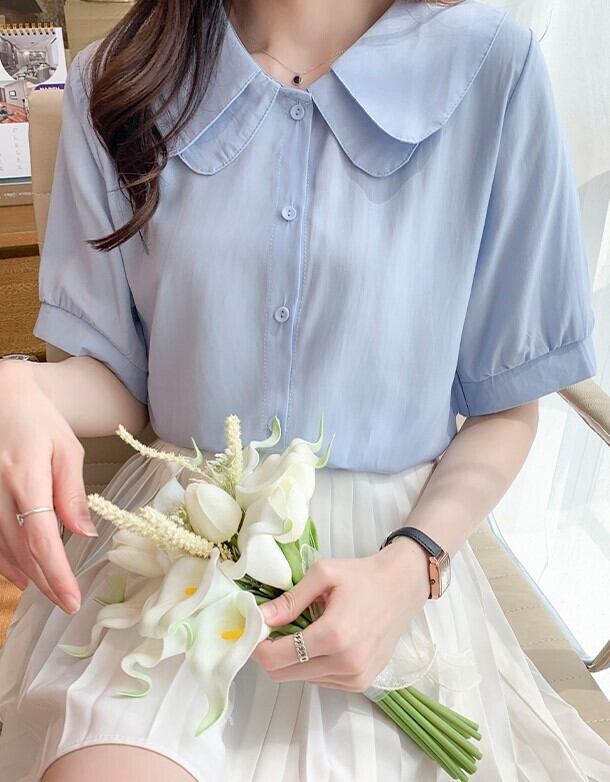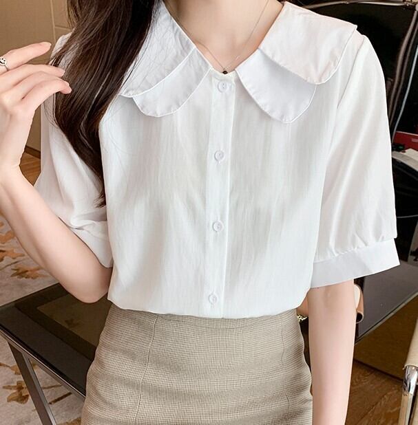 ブラウス シャツ レディース 五分袖 無地 春夏 オフィス テレワーク フリル 清楚 シンプル ab2219