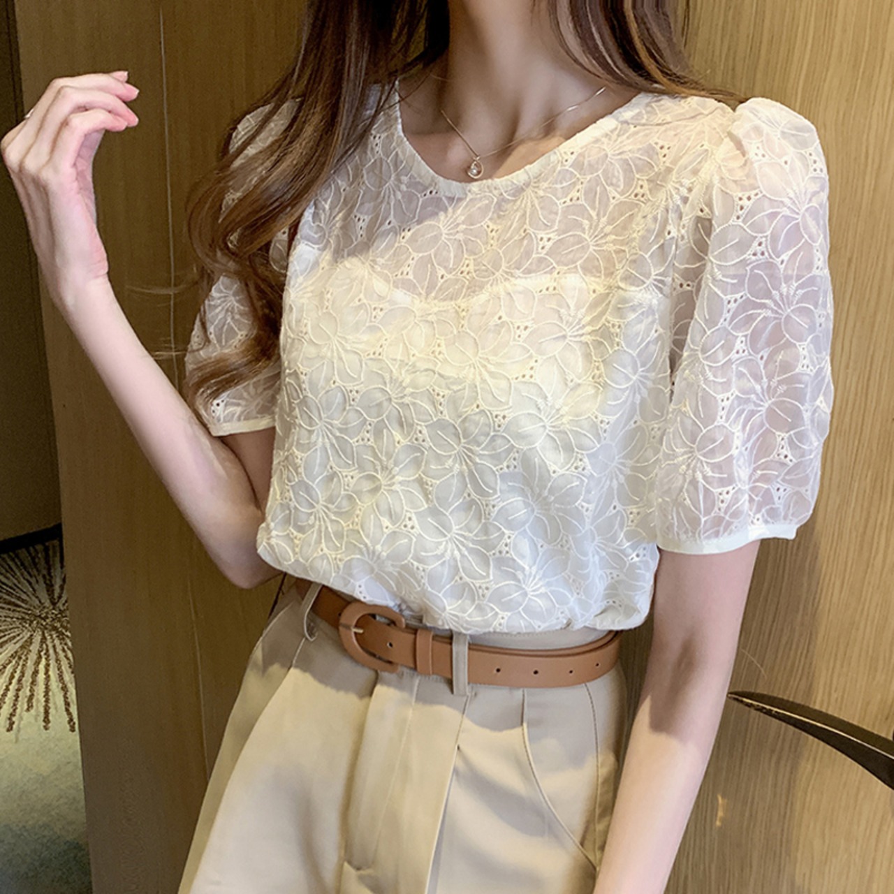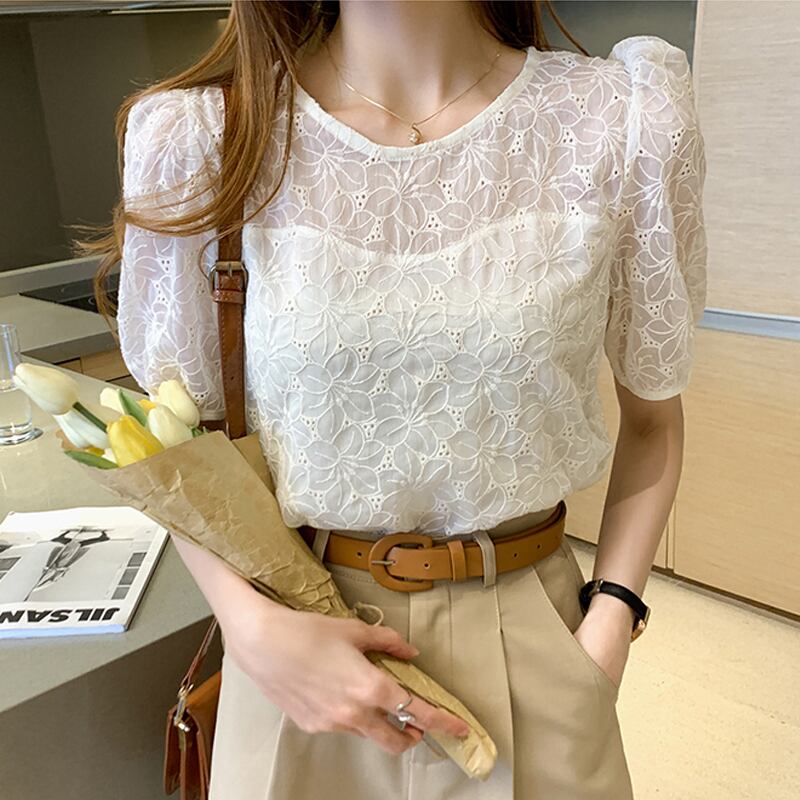 シフォンシャツ トップス シフォン パンチングレース レース 半袖 夏 パフスリーブ 透け感 ママコーデ 通勤 OL オフィス デート MH3391