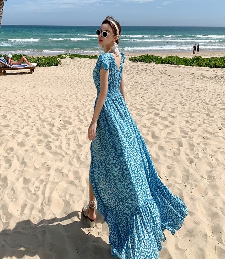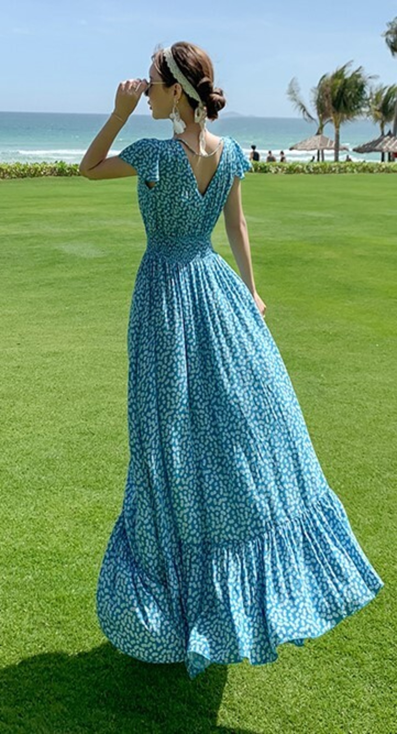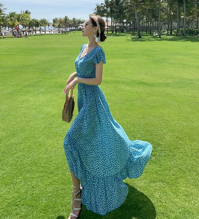 ワンピース レディース ロング丈 Vネック 花柄 小花柄 春夏 半袖 Aライン ハイウエスト リゾート 旅行 ガーリー フェミニン ab2234