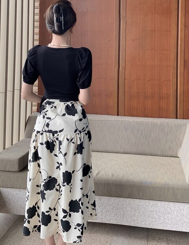 無地のトップスと花柄スカートのセットアップ。