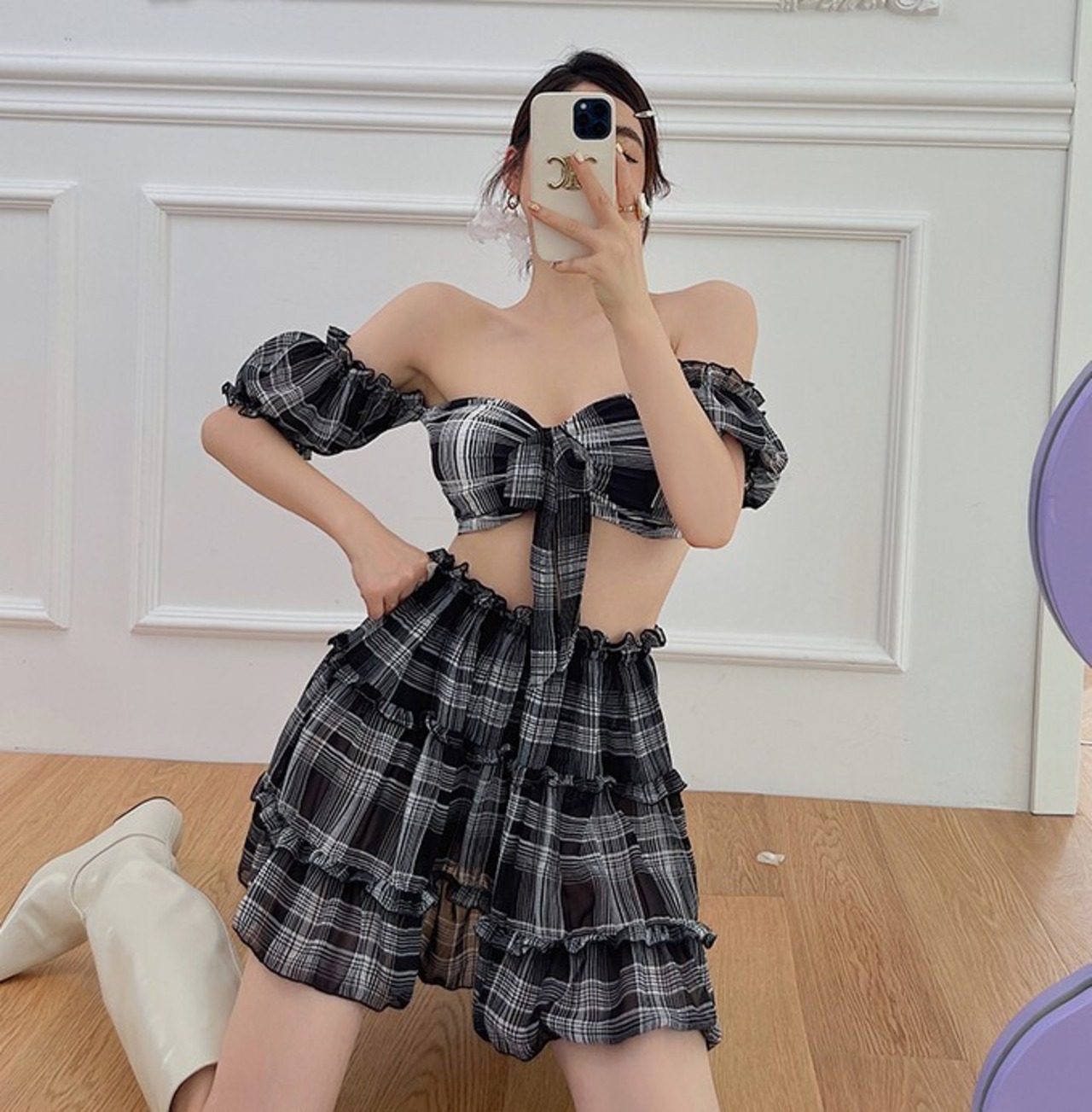 水着 スリーピース ビキニ レディース チェック 体型カバー フリル スカート フェミニン バックオープン セクシー ab2257