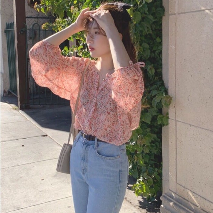 シフォンブラウス トップス 長袖 花柄 フローラル エアリー スクエアネック 春夏 ガーリー 大人可愛い ママコーデ デート お出かけ MH3401
