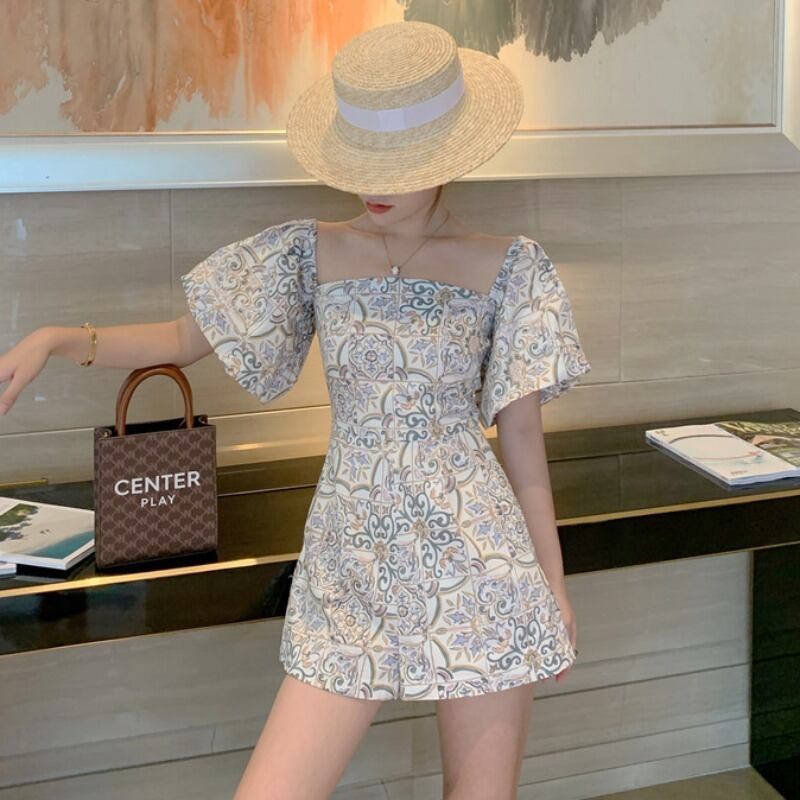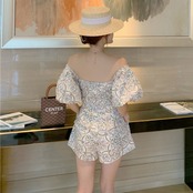 サロペット オールインワン パフスリーブ タイルモチーフ オフショルダー クラシカル シック おしゃれ 夏 ママコーデ デート お出かけ MH3408