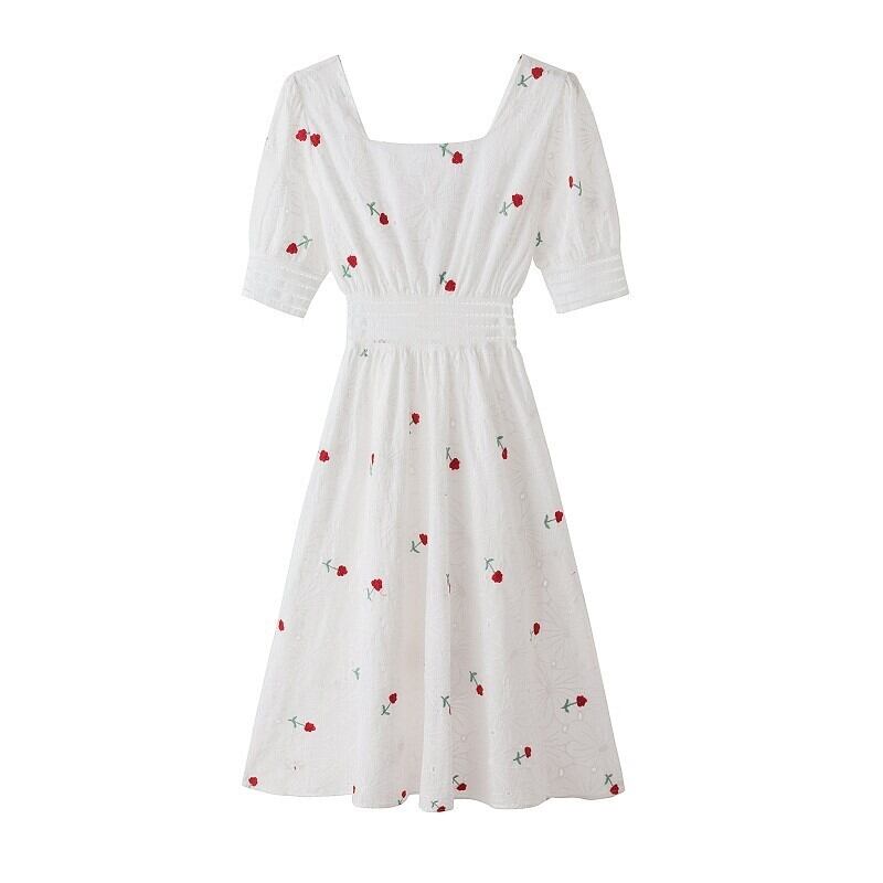 フラワーレースワンピース ワンピース フラワーレース スクエアネック 半袖 レース 刺繍 ミモレ丈 Aライン きれいめ ガーリー デート ママコーデ お出かけ 夏 MH3414