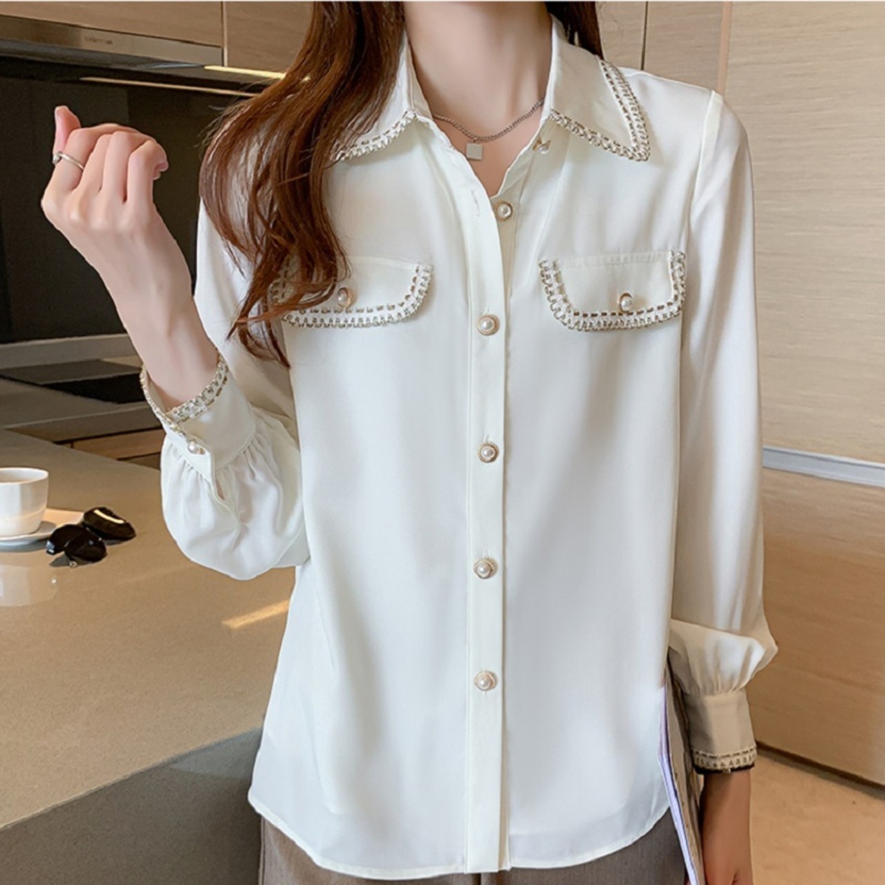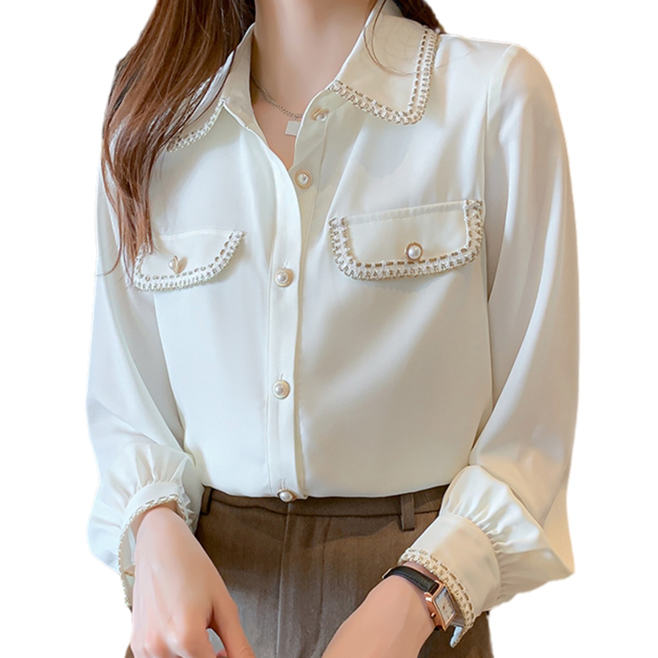 シフォンシャツ トップス 長袖 パールボタン 刺繍糸 おしゃれ ママコーデ きれいめ お出かけ デート MH3429
