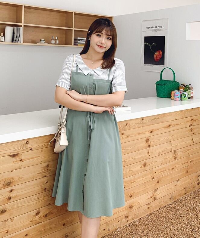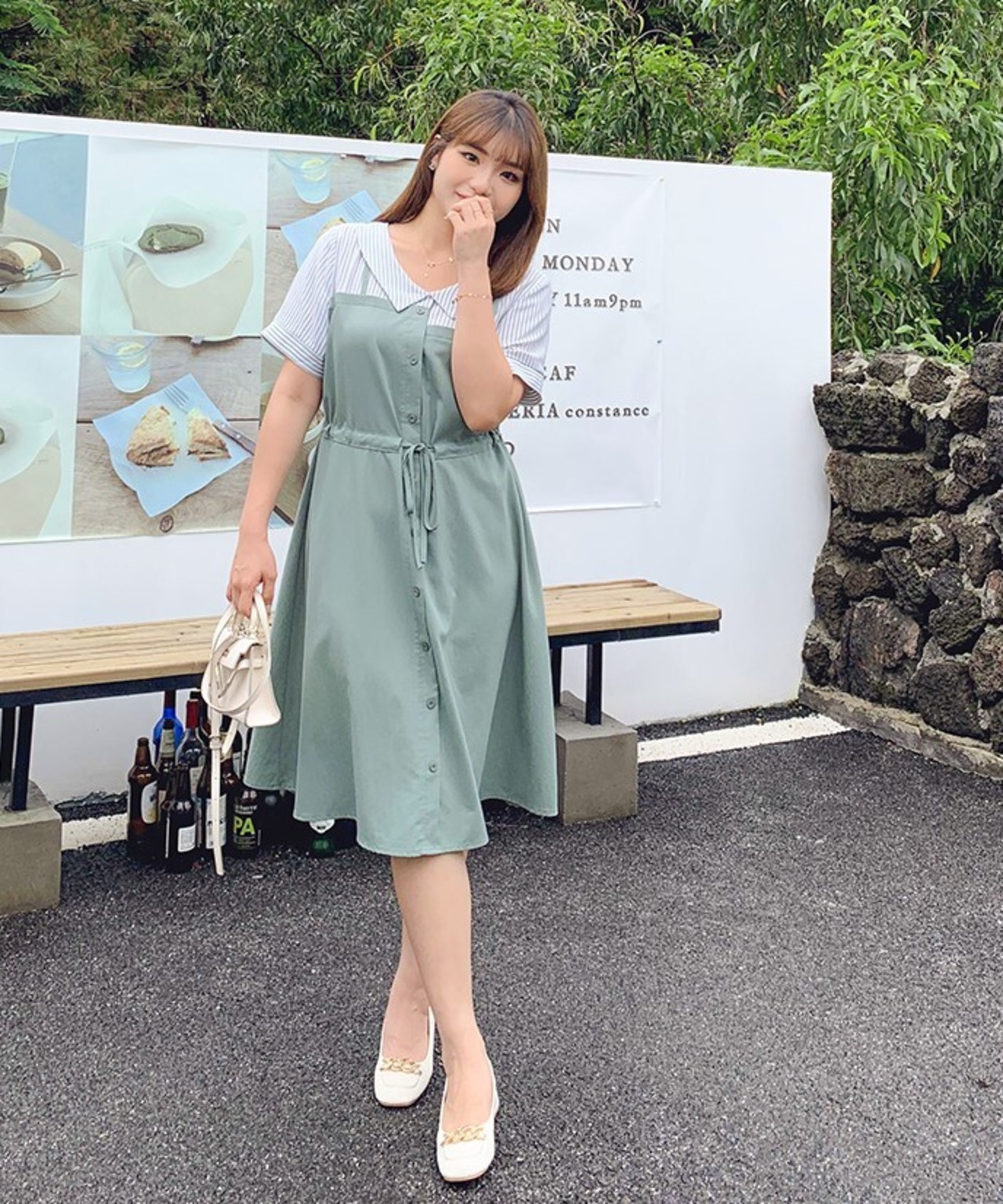 ワンピース レディース 異素材ミックス ドッキングワンピ 春夏 大きいサイズ 半袖 ひざ丈 フェイクツーピース ガーリー プチプラ ab2323