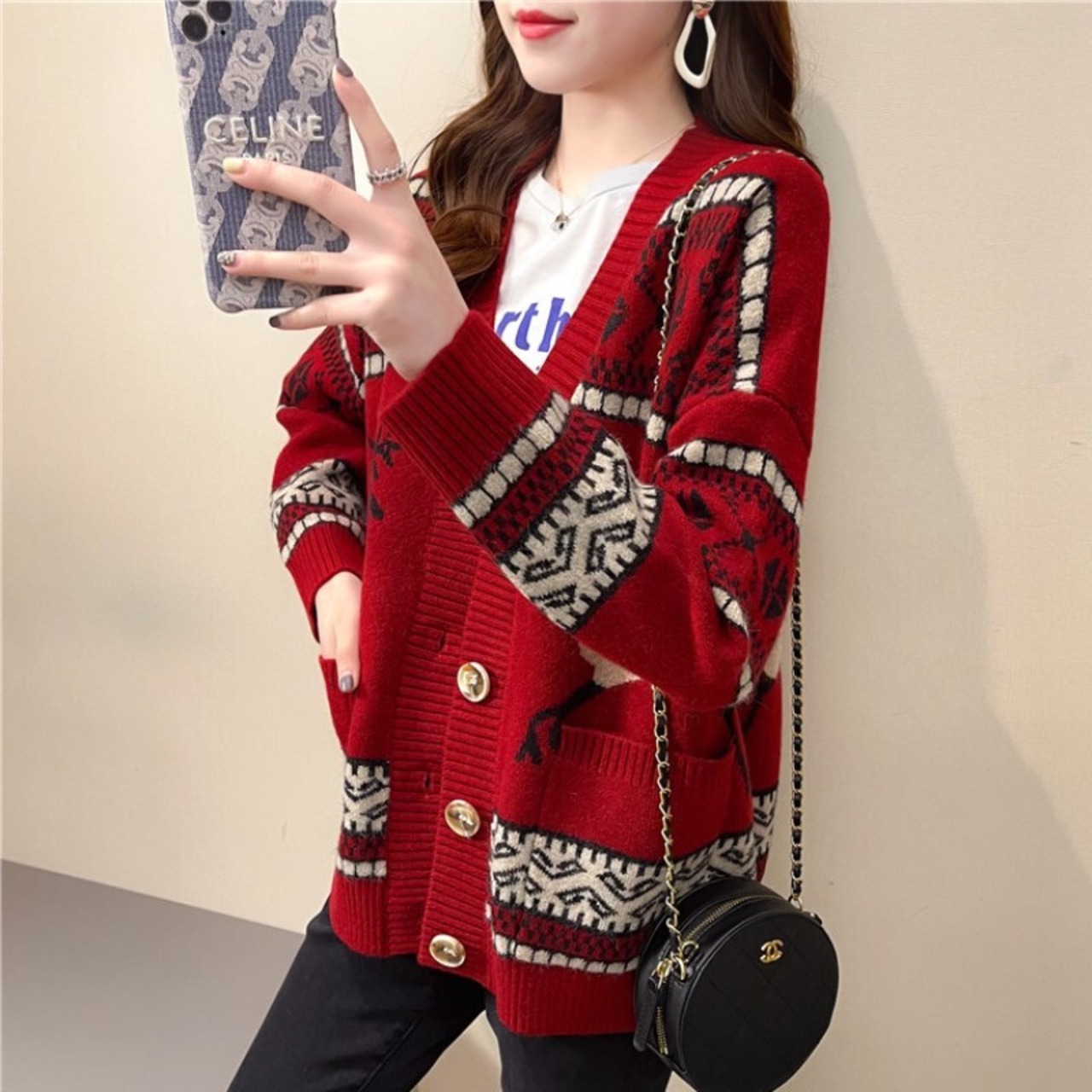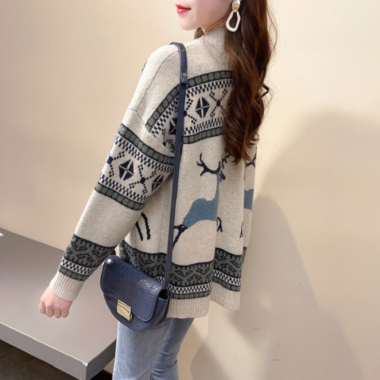 ニットカーディガン トップス カーディガン セーター ニット Vネック 長袖 秋冬 レトロ 冬柄 カジュアル ママコーデ デート お出かけ MH3465