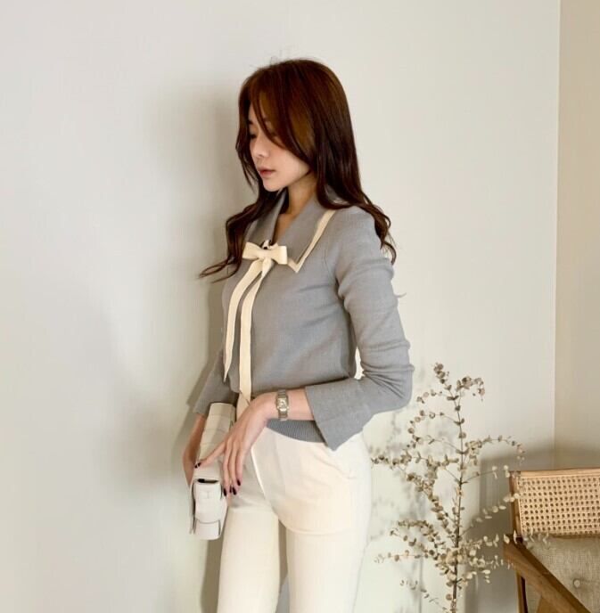 ニット プルオーバー トップス セーター レディース 秋冬 リボン バイカラー リボンタイ 長袖 フレアスリーブ バイカラー オフィス ガーリー ab2369