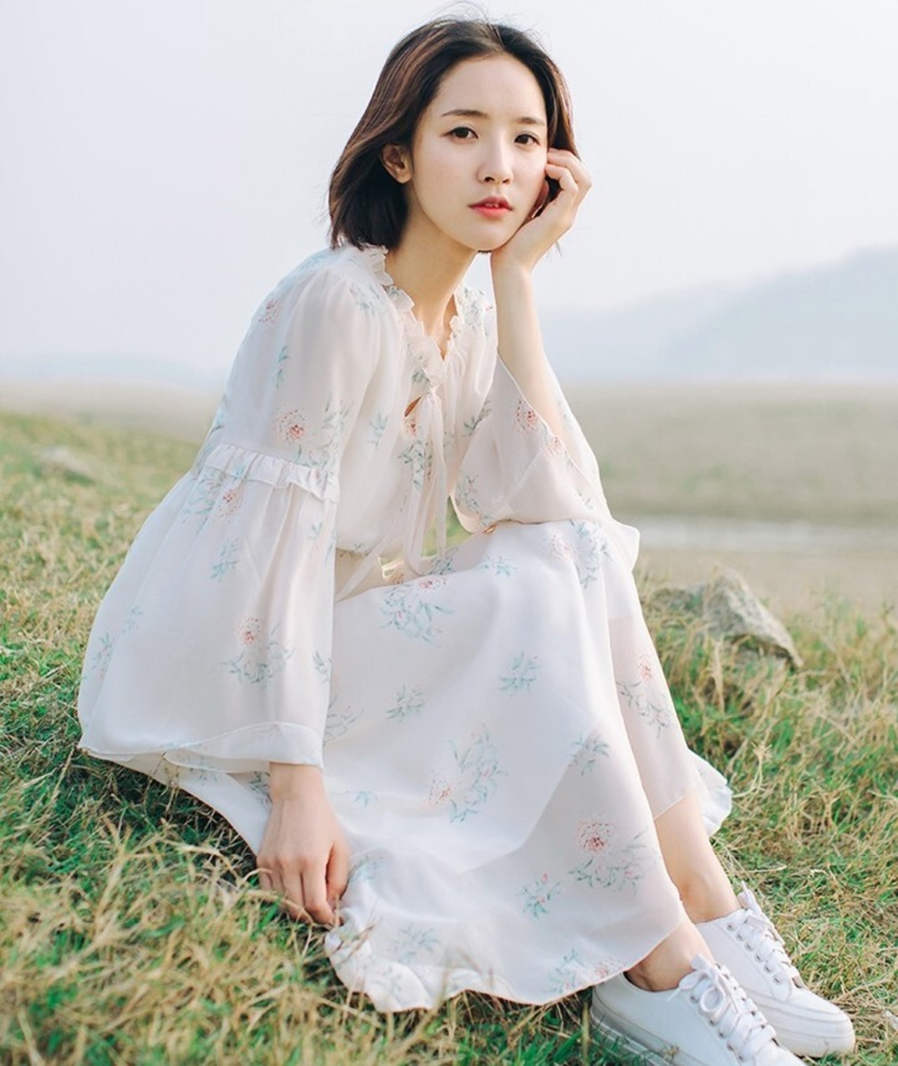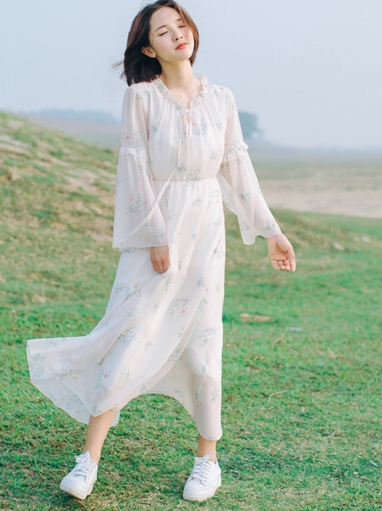 ワンピース 春夏 春ワンピ ロング丈 花柄 フリル フレアスリーブ フェミニン シフォン ハイウエスト フェアリー ab2401