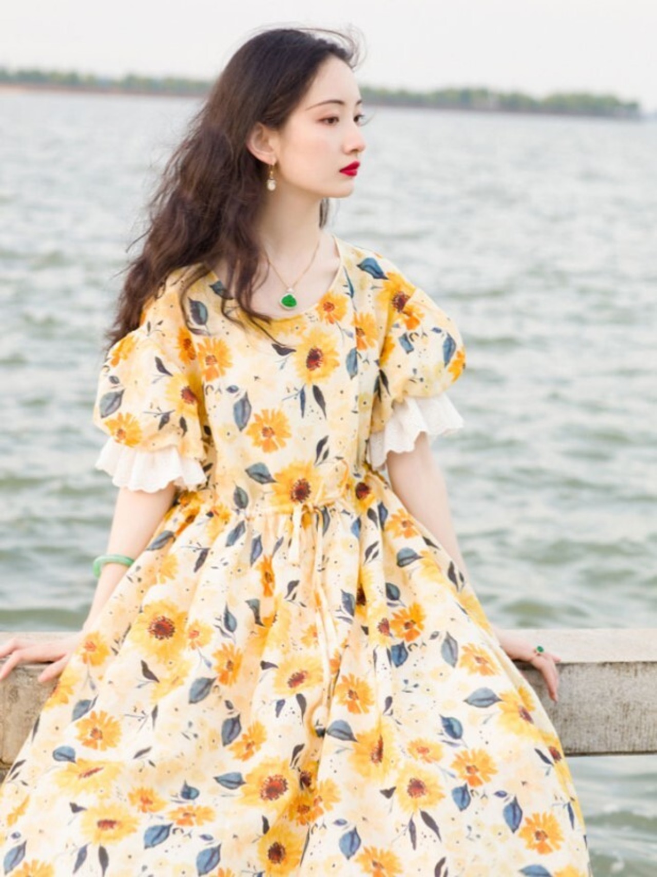 ワンピース 夏ワンピ マタニティワンピ マタニティ 春夏 ひまわり 花柄 半袖 フリル ロング丈 フェミニン ab2405