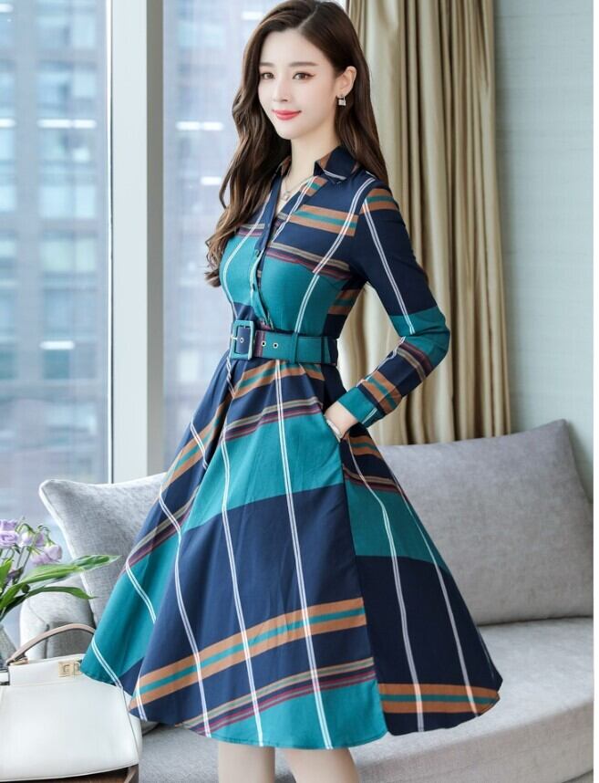 ワンピース レディース 春ワンピ ひざ丈 長袖 チェック レトロ Vネック Aライン ふんわり ベルト ガーリー プチプラ ab2420