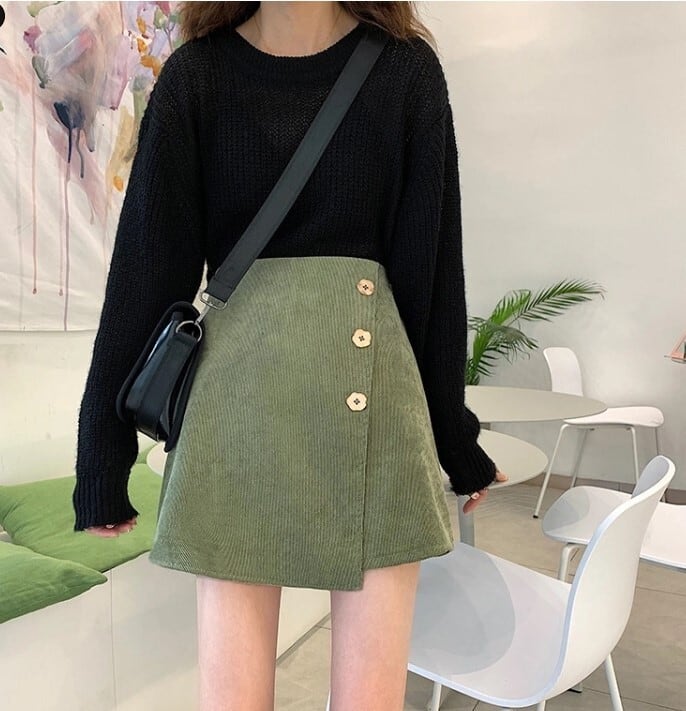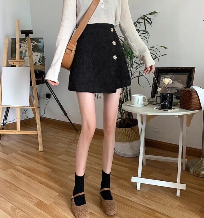 スカート コーデュロイ レディース ミニ丈 ミニスカート 秋冬 花ボタン Aライン ガーリー アシンメトリー ハイウエスト ab2422