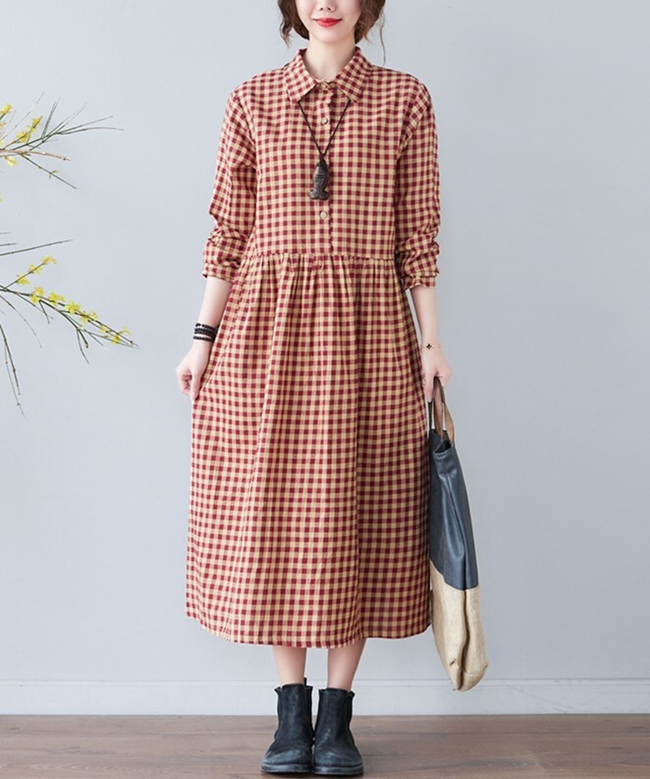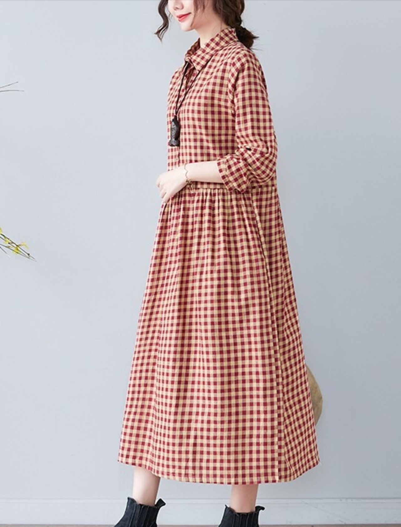ワンピース 春秋 五分袖 レディース ミモレ丈 チェック 格子柄 ガーリー カジュアル シャツワンピ ab2427