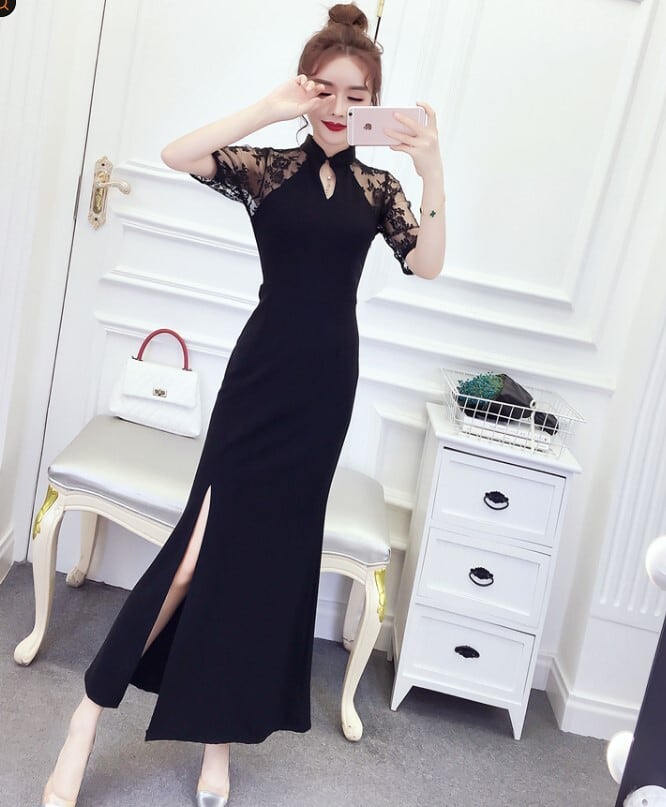 ドレス チャイナドレス ロング丈 レディース スリット エレガント レトロ レース 半袖 ハイネック 無地 パーティー ab2430