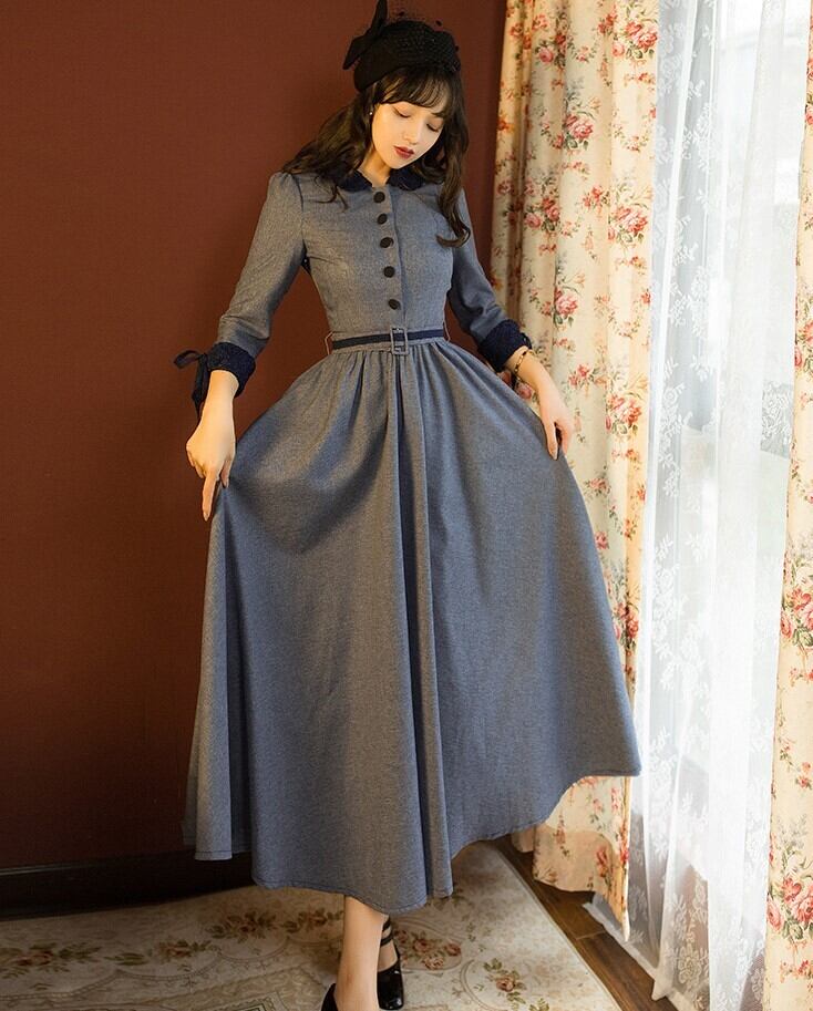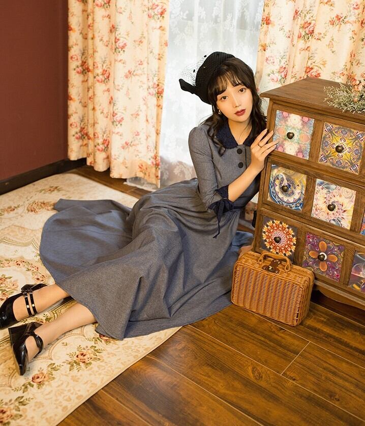 ワンピース レディース 春秋 ロング丈 ロングワンピ シック 長袖 バイカラー レトロ Aライン シャツ襟 ボタン 清楚 プチプラ ab2434
