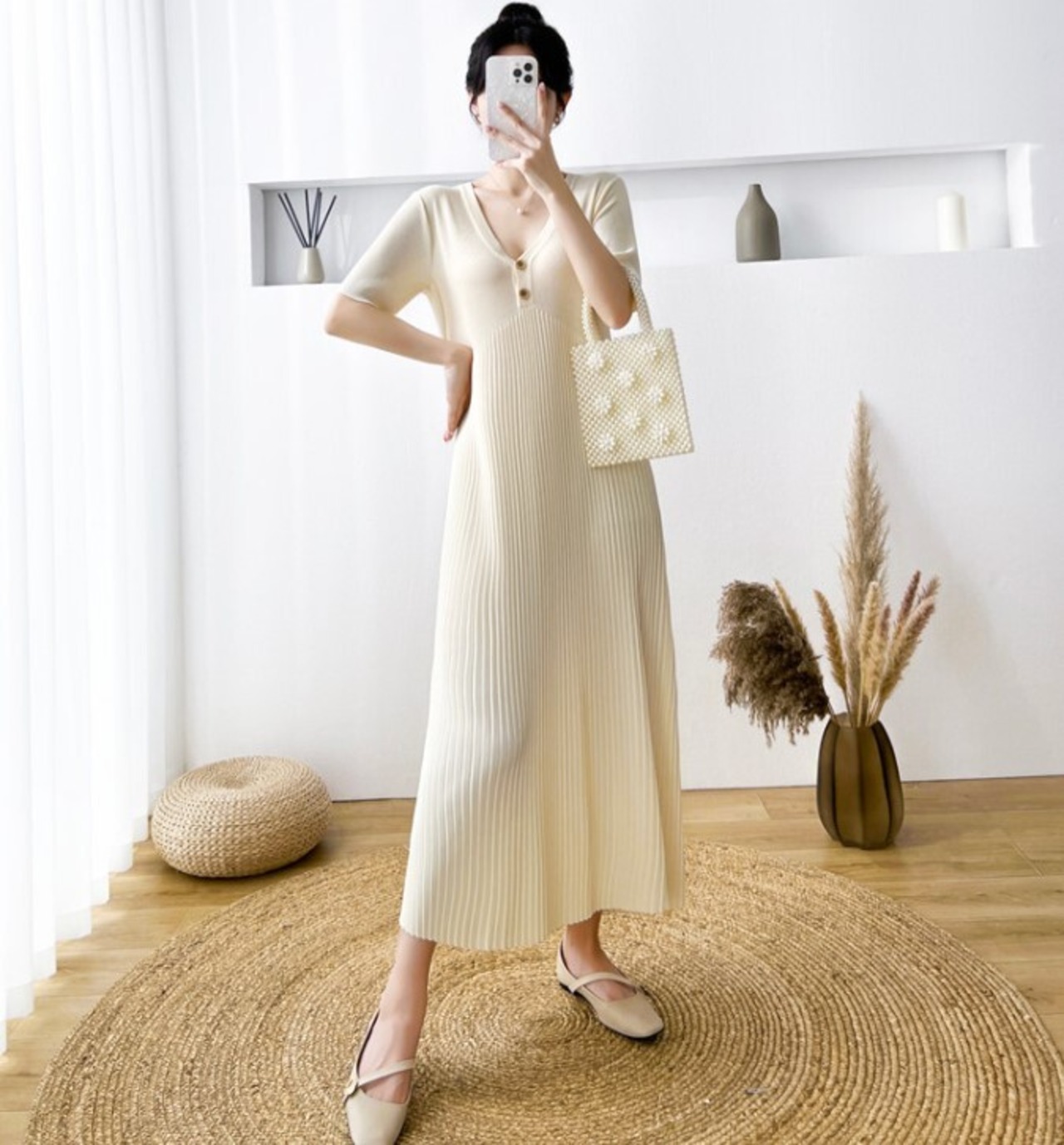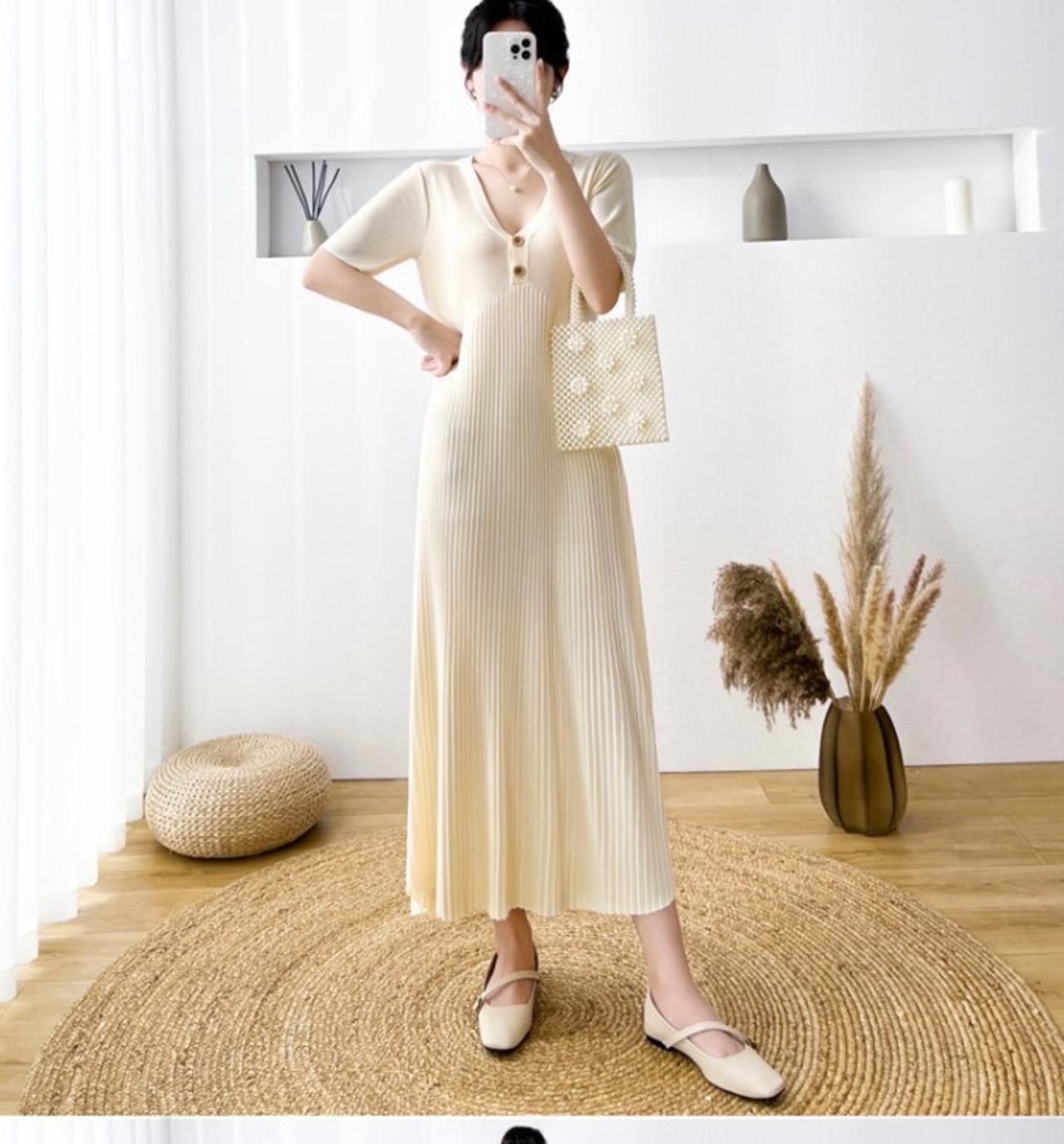 ワンピース レディース ロング丈 切替 プリーツ 体型カバー 無地 Aライン ナチュラル カジュアル Vネック ab2442