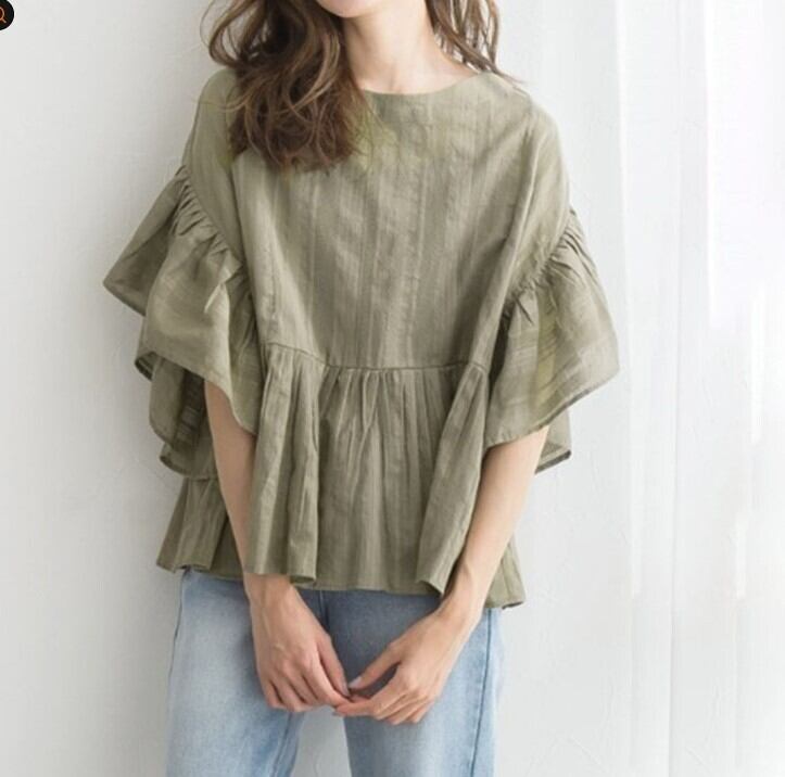 トップス レディース 春夏 チュニック プルオーバー フリル フレアスリーブ ふんわり ストライプ カジュアル ママコーデ ab2449