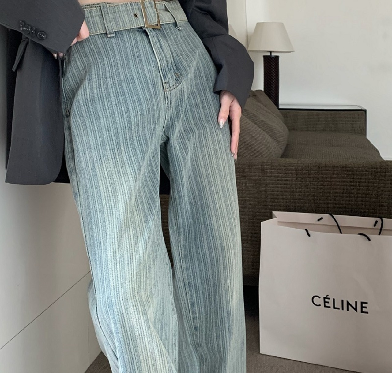 デニムパンツ パンツ デニム ジーンズ ジーパン ベルト付き ストライプ柄 ストレート 脚長効果 カジュアル ママコーデ デート お出かけ MH3544