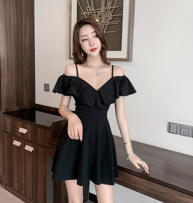 ワンピース ミニ丈 レディース 無地 オフショルダー フリル セクシー ハイウエスト Aライン 深Vネック プチプラ ab2453